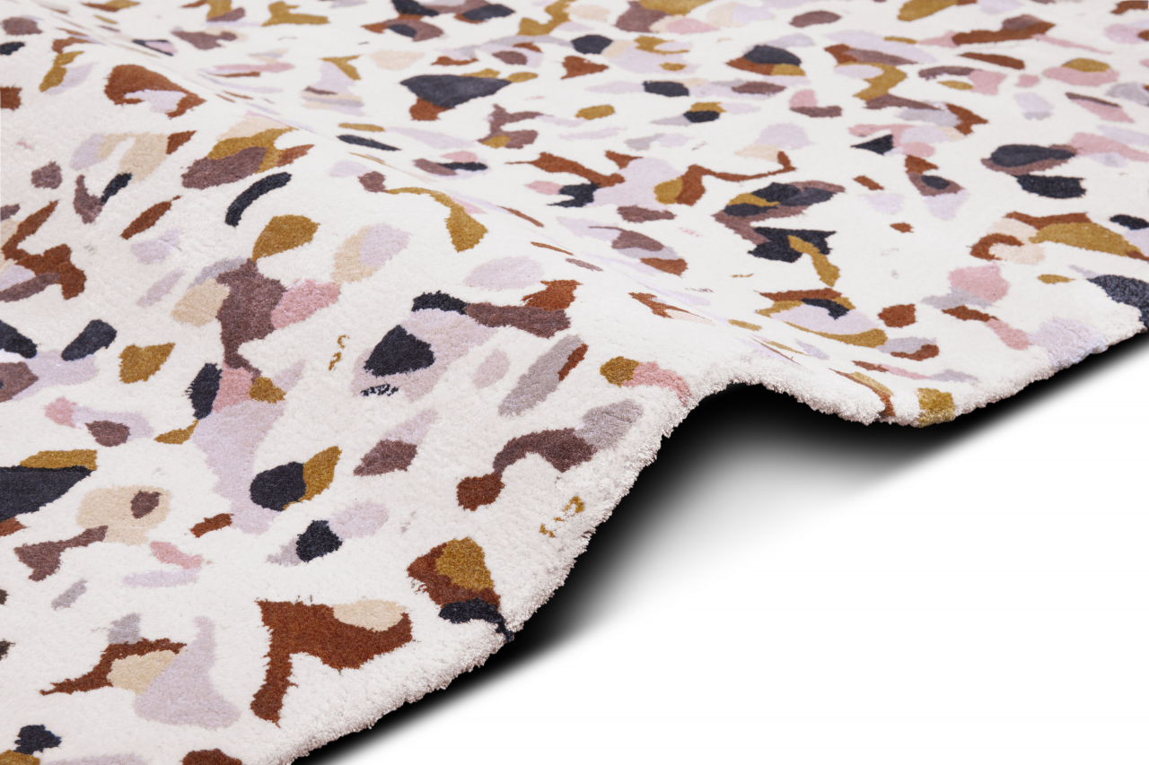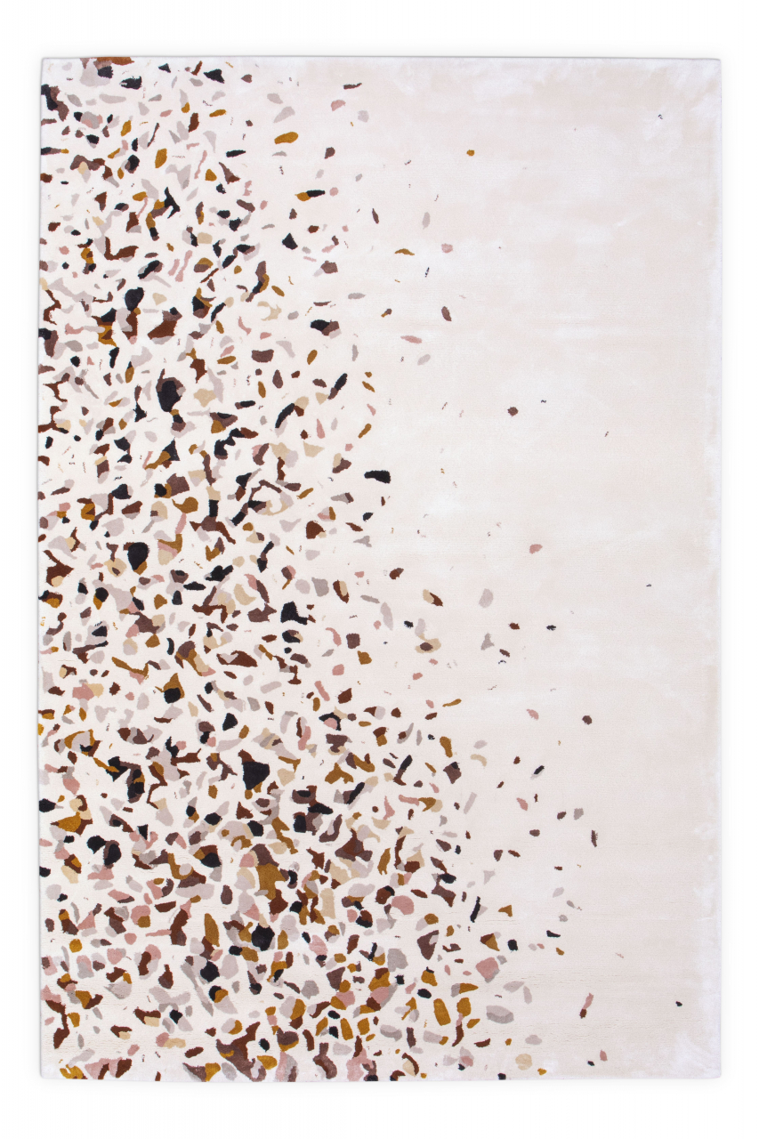 Ковер с утончённым абстрактным рисунком, напоминающим мозаичное рассеивание каменной крошки на светлом фоне. Тёплые оттенки терракоты, охры и графита создают мягкий контраст и ощущение движения. Лёгкий градиентный переход придаёт ковру воздушность и глубину. Такой дизайн прекрасно впишется в современный интерьер, добавив в него текстуру, свет и естественную гармонию.