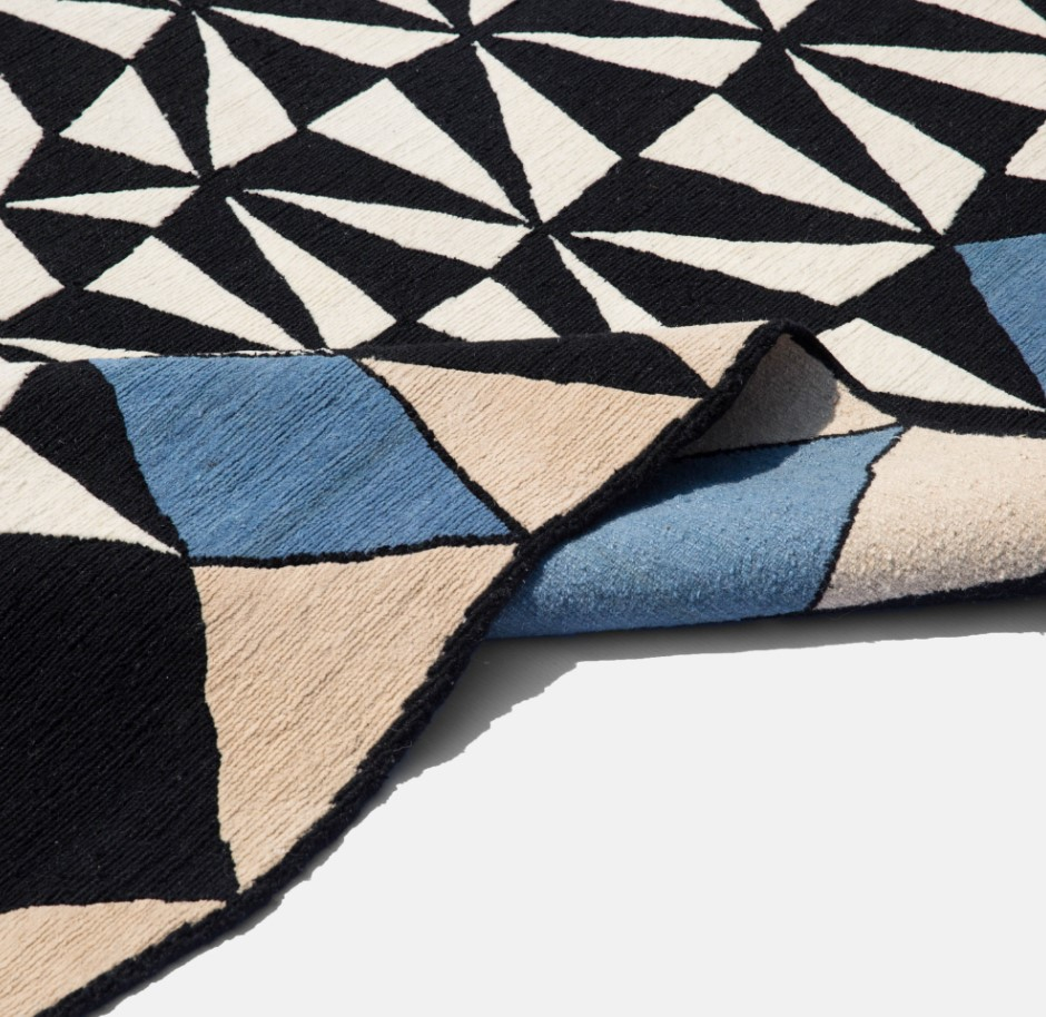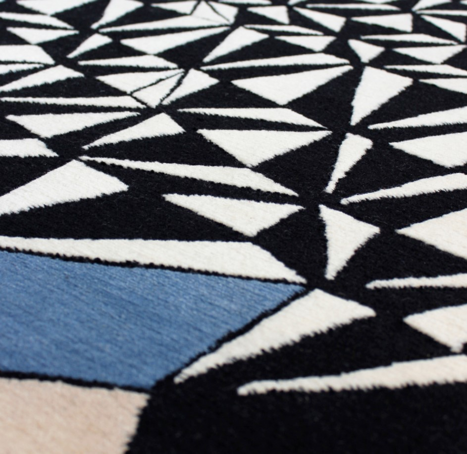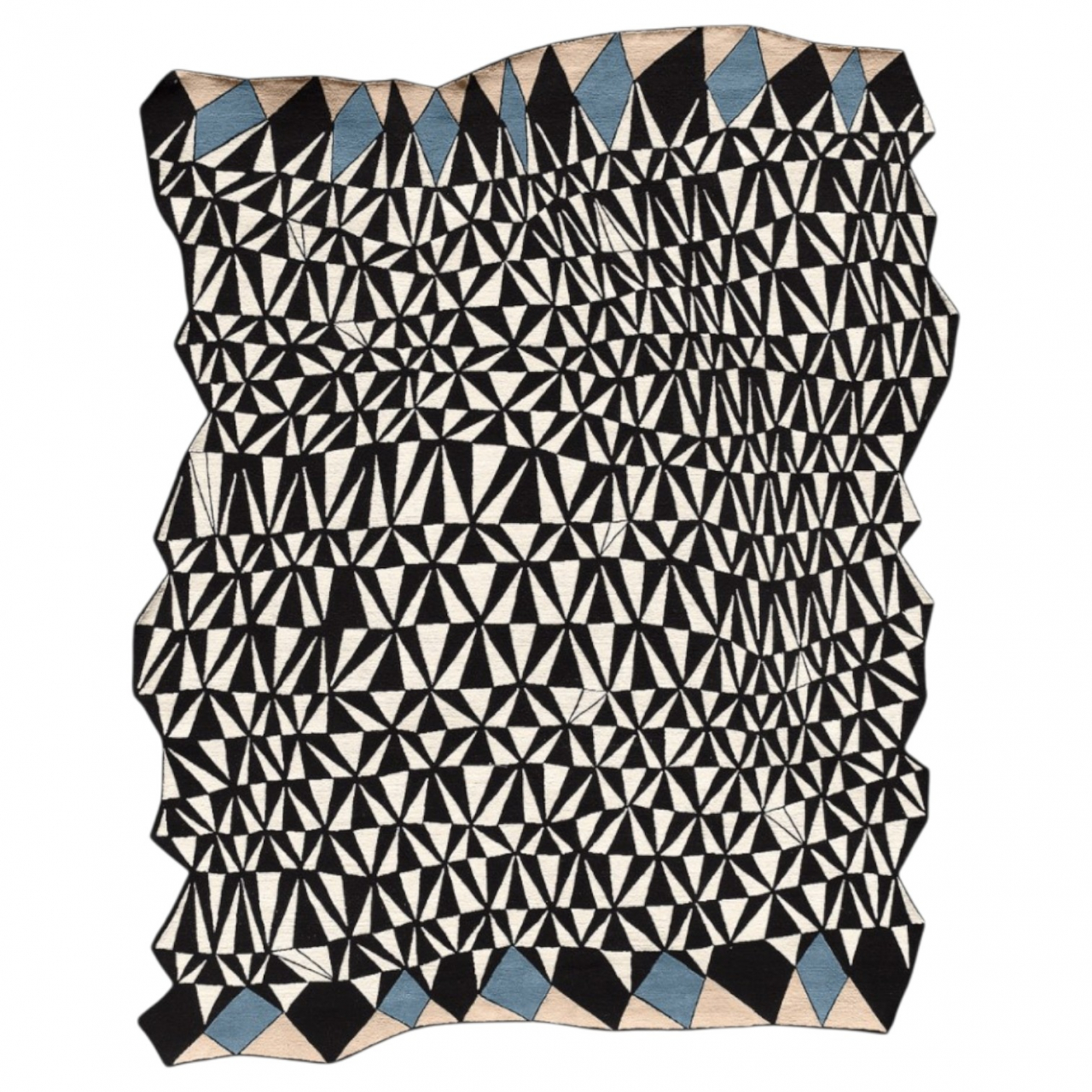 Ковер с выразительным графическим узором, построенным на ритмичном повторении треугольных форм. Контраст чёрного и белого создаёт динамичный оптический эффект, а акценты нежно-голубого добавляют глубину и лёгкость композиции. Неровный контур усиливает ощущение движения и делает дизайн живым и скульптурным. Такой ковер идеально подойдёт для современных интерьеров, где ценится смелая геометрия и визуальная энергия.