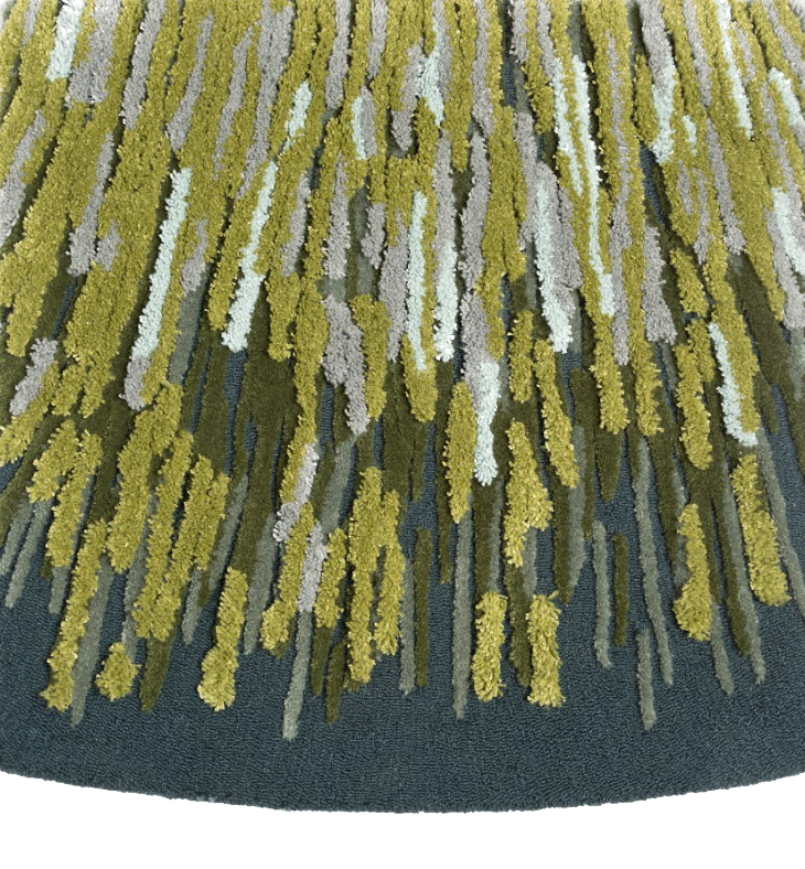 Ковер круглой формы с эффектным радиальным рисунком, напоминающим солнечные лучи или вспышку света. Золотистые, серебристые и светло-серые оттенки создают ощущение сияния и энергии, а тёмная окантовка подчёркивает глубину композиции. Такой ковер станет центральным элементом интерьера — он добавит пространству динамику, свет и утончённую роскошь.