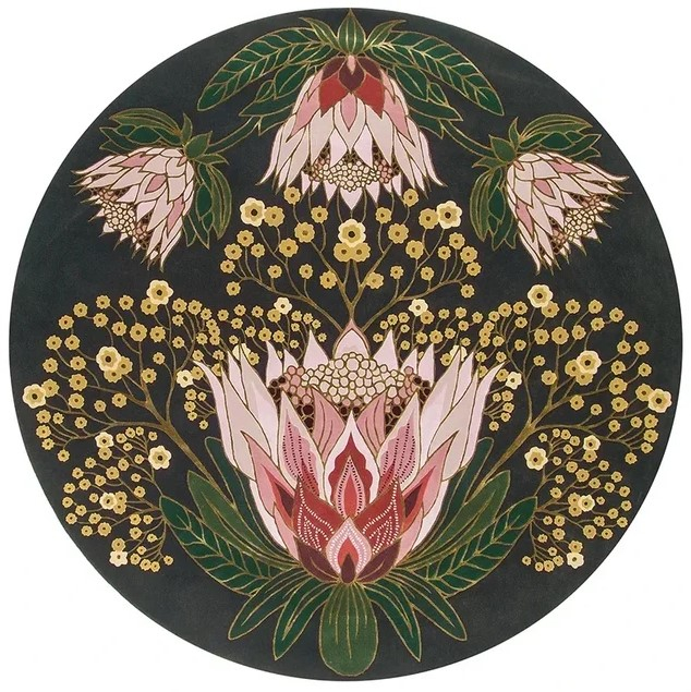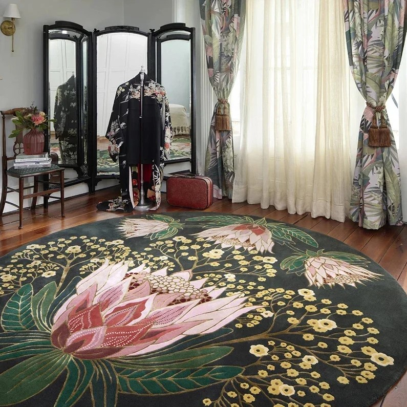 Ковер круглой формы с изысканным ботаническим орнаментом. На глубоком тёмном фоне распускаются крупные протеи и ветви мелких цветов, выполненные в мягких оттенках розового, кремового и зелёного с золотистыми акцентами. Богатый рисунок напоминает декоративную живопись и придаёт интерьеру утончённость и теплоту. Такой ковер станет выразительным центром композиции, добавляя пространству артистичность и природную элегантность.