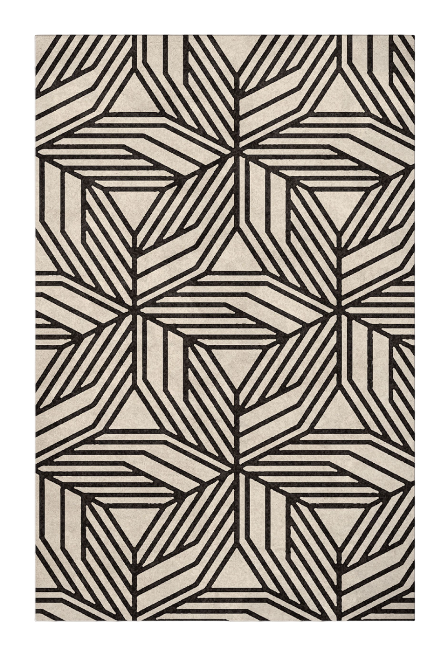 Ковер с ритмичным геометрическим орнаментом, построенным на сочетании линий и форм, создаёт ощущение глубины и архитектурной структуры. Контрастный рисунок в чёрно-бежевой гамме выглядит выразительно, но при этом остаётся нейтральным и легко вписывается в интерьер.