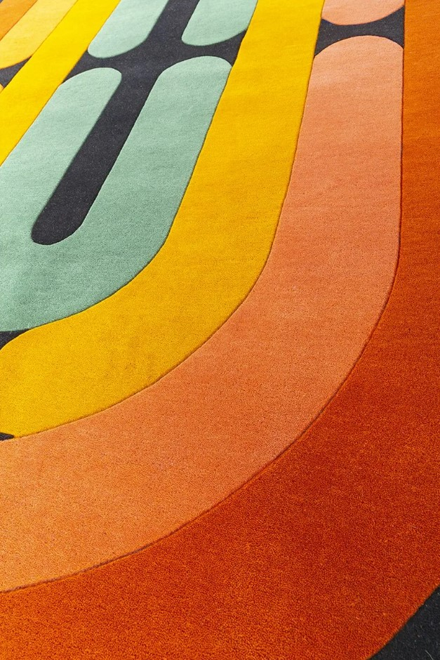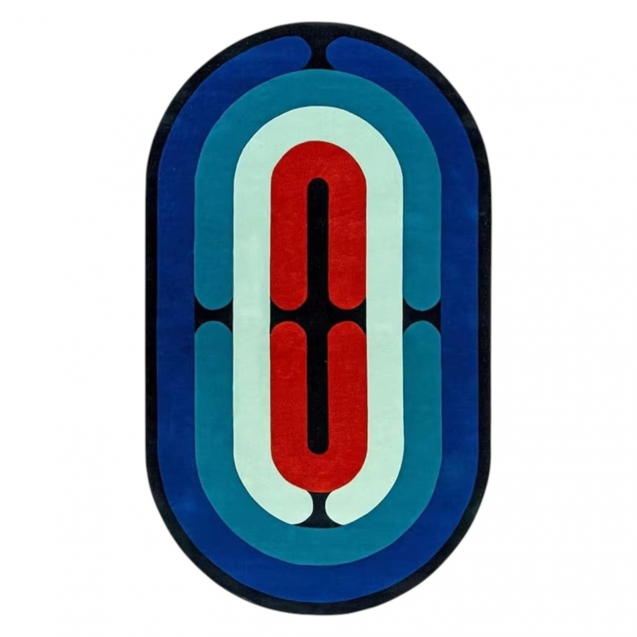 Ковер в стиле модерн с выразительным графичным рисунком и насыщенной цветовой палитрой. Геометрический орнамент в оттенках синего, голубого, красного и чёрного создает динамичную композицию, напоминающую абстрактное искусство середины XX века. Мягкая текстура и плавные линии придают ковру уют, а яркие цвета делают его акцентом в интерьере, подчёркивая современный характер пространства.