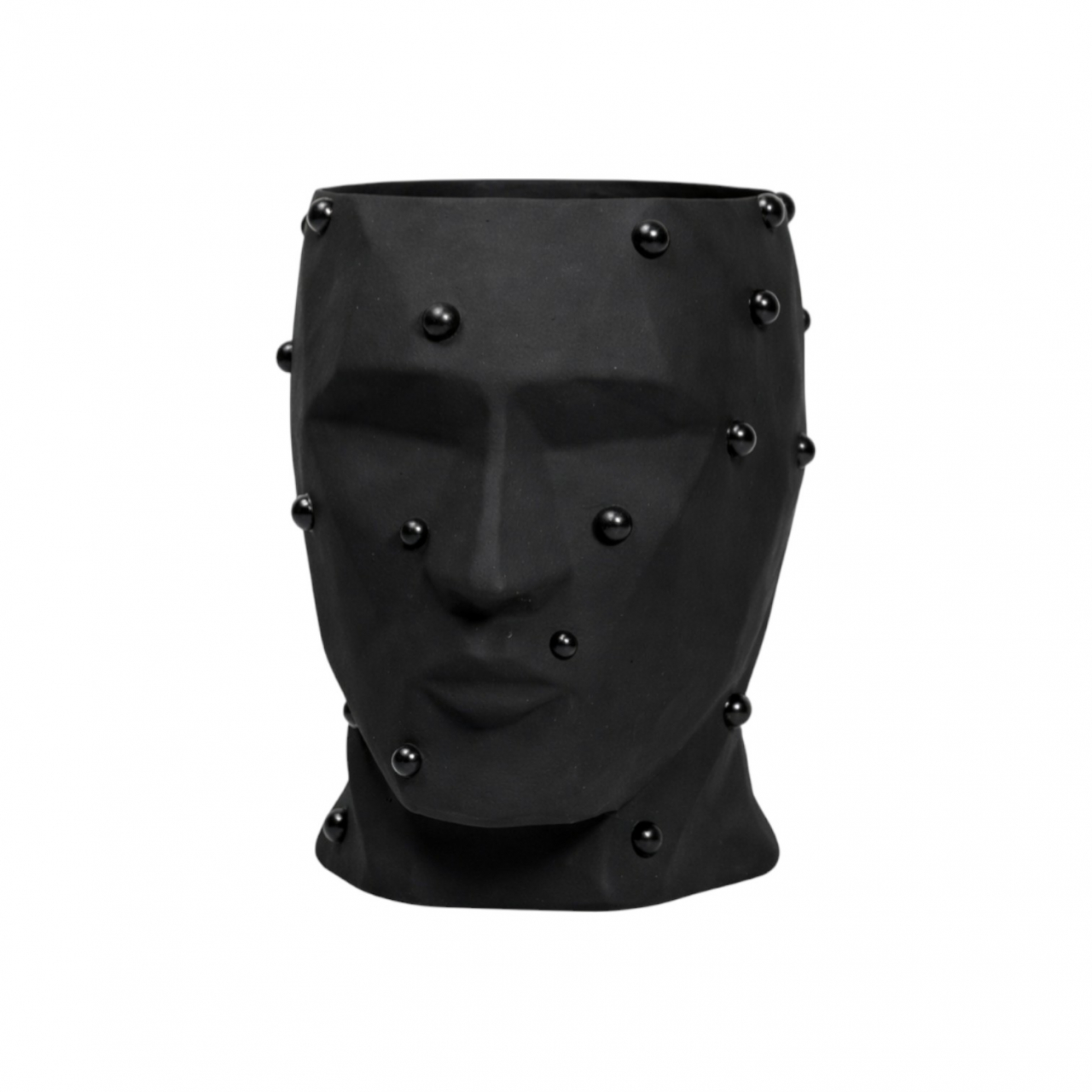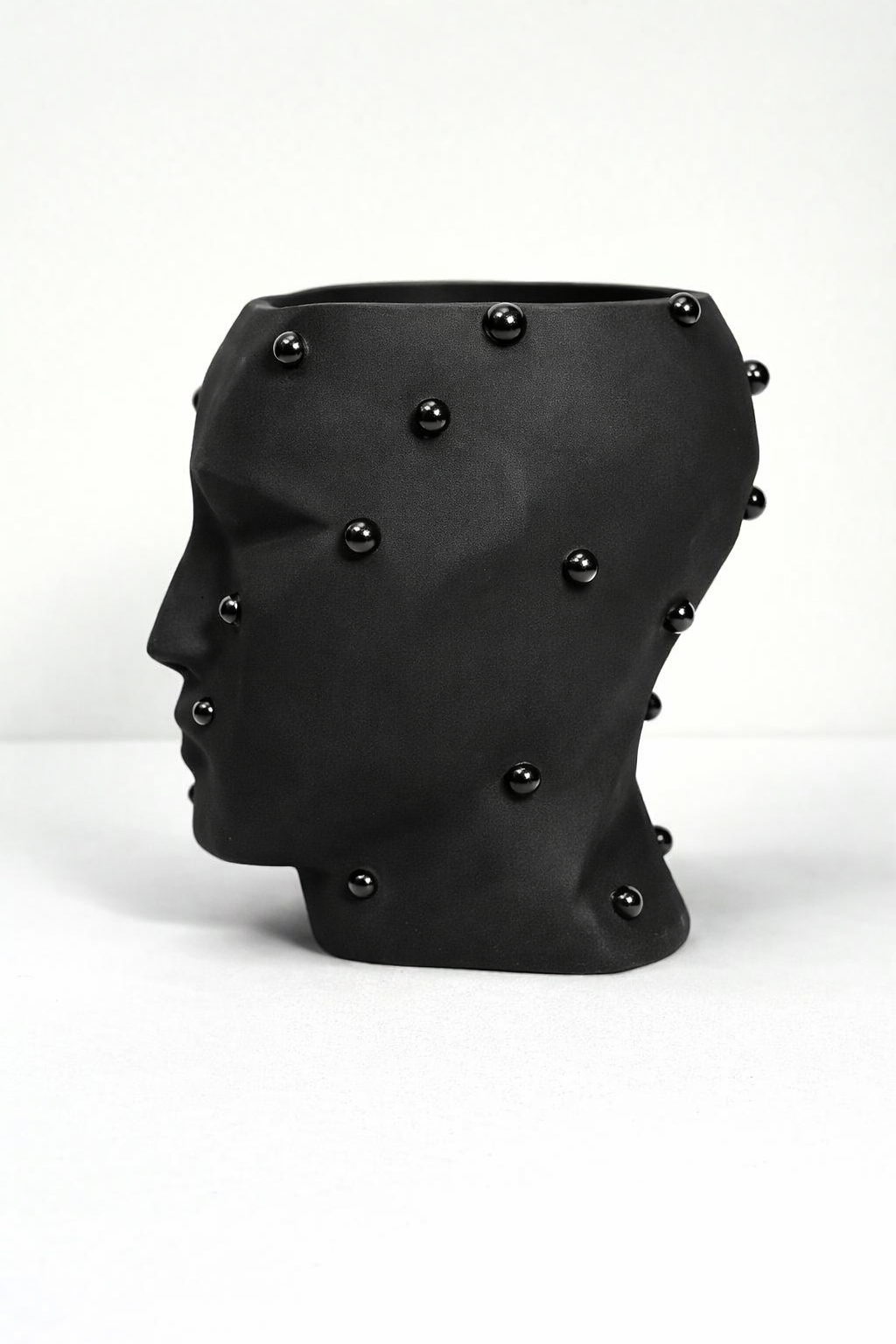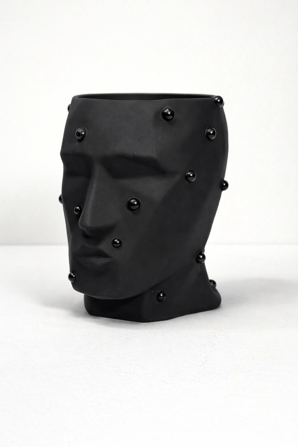 Матовая чёрная керамика подчёркивает выразительность линий и игру света на поверхности. Декоративные сферические акценты добавляют фактурности и делают изделие особенно притягательным вблизи. Минималистичный, но характерный дизайн позволяет кашпо органично вписаться в современные интерьеры — от минимализма и лофта до арт-деко и концептуальных пространств.