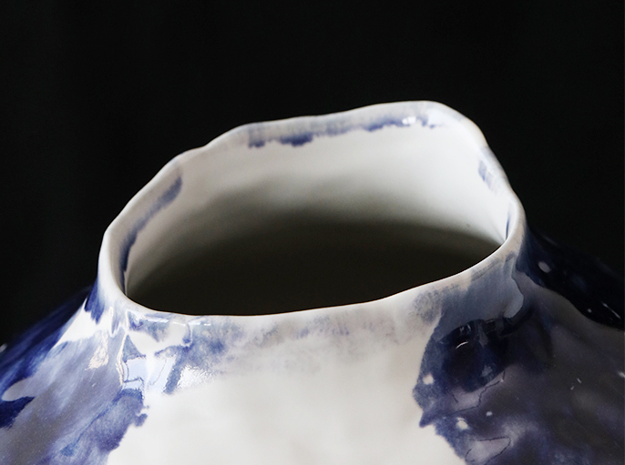 Эти керамические вазы словно несут отпечаток живого движения — глянцевая белая поверхность с глубокими синими потёками напоминает о свободе мазка художника. Их неровная форма и ручная текстура придают им особую чувственность и характер. Это предметы, в которых сочетаются простота материала и выразительность искусства.