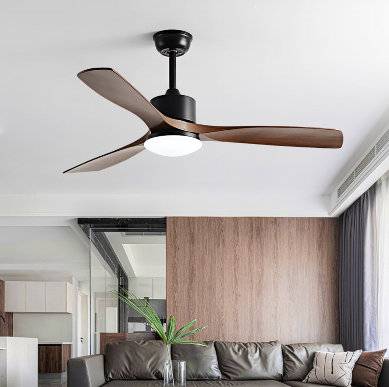 Современный потолочный вентилятор с тремя аэродинамичными лопастями обеспечивает мягкий и равномерный поток воздуха, а встроенный LED-светильник создаёт комфортное базовое освещение. Лаконичный дизайн в белом или черном цвете легко вписывается в любой интерьер — от минимализма до сканди. Доступны разные варианты управления: с помощью пульта ДУ или через настенный выключатель, что позволяет подобрать удобный способ эксплуатации под конкретное пространство.