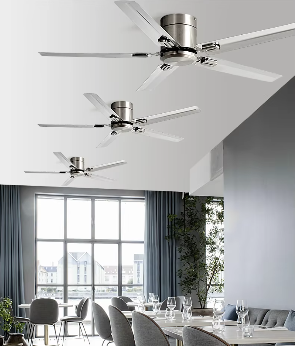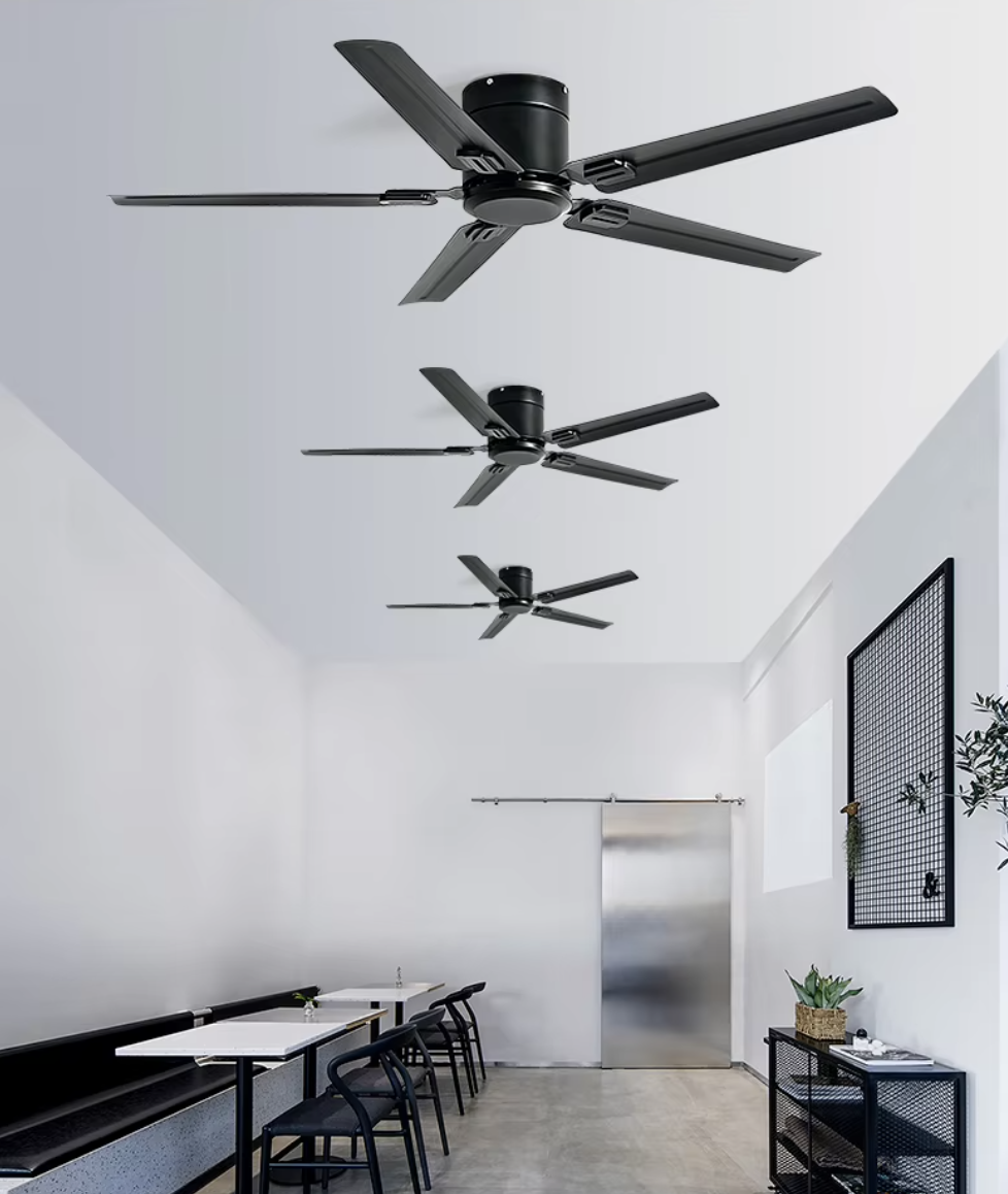 Минималистичный потолочный вентилятор с пятью прочными металлическими лопастями обеспечивает мощный и направленный поток воздуха. Стильный корпус в металлическом исполнении делает модель идеальной для современных интерьеров и коммерческих пространств. Доступны варианты управления: пульт дистанционного управления или настенный выключатель — выбирайте тот, который подходит вашему проекту.