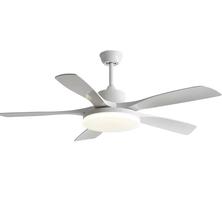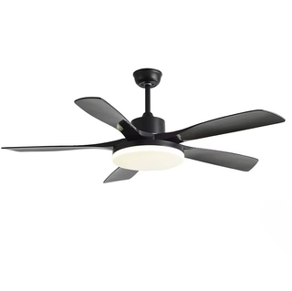 Потолочный вентилятор с LED-светильником и аэродинамичными лопастями Современный потолочный вентилятор с пятью изящно изогнутыми лопастями обеспечивает мощный, но тихий поток воздуха, идеально подходящий для жилых и коммерческих интерьеров. Встроенный LED-светильник даёт мягкое и равномерное освещение, а удобное управление (пульт ДУ или настенный переключатель — зависит от комплектации) делает использование максимально комфортным.