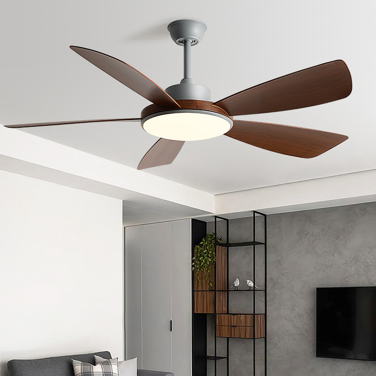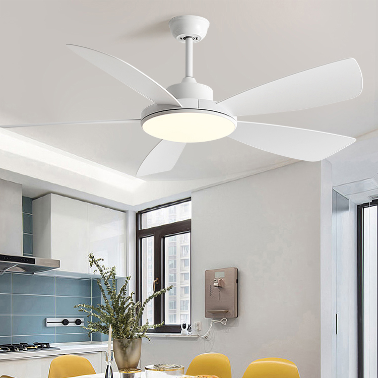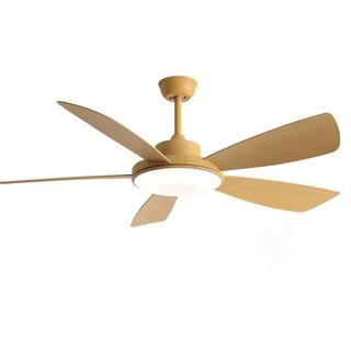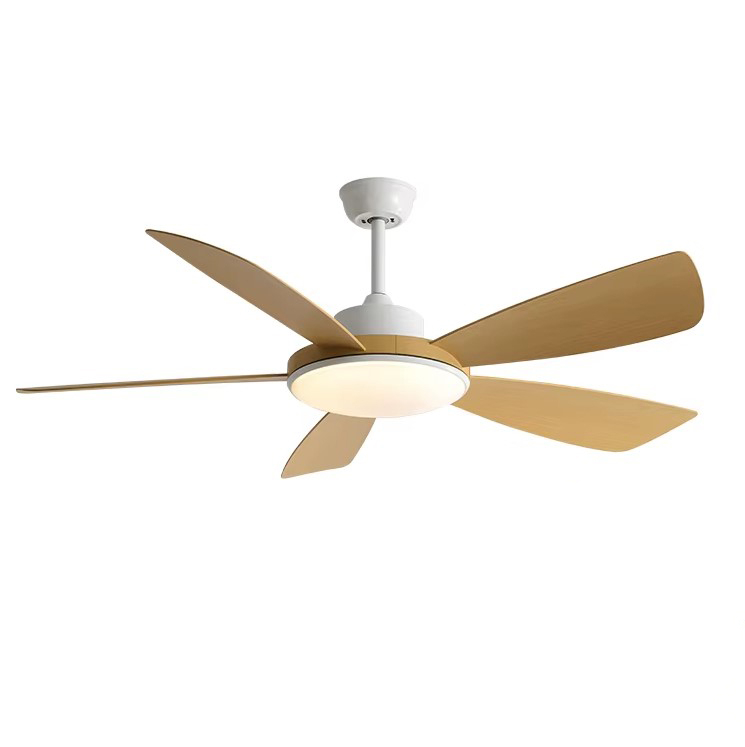 Потолочный вентилятор с LED-светильником и аэродинамичными лопастями Современный потолочный вентилятор с пятью изящно изогнутыми лопастями обеспечивает мощный, но тихий поток воздуха, идеально подходящий для жилых и коммерческих интерьеров. Встроенный LED-светильник даёт мягкое и равномерное освещение, а удобное управление (пульт ДУ или настенный переключатель — зависит от комплектации) делает использование максимально комфортным.