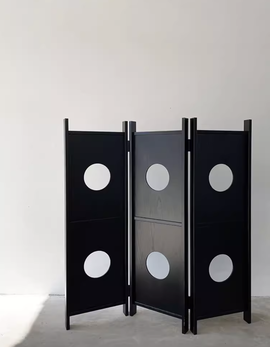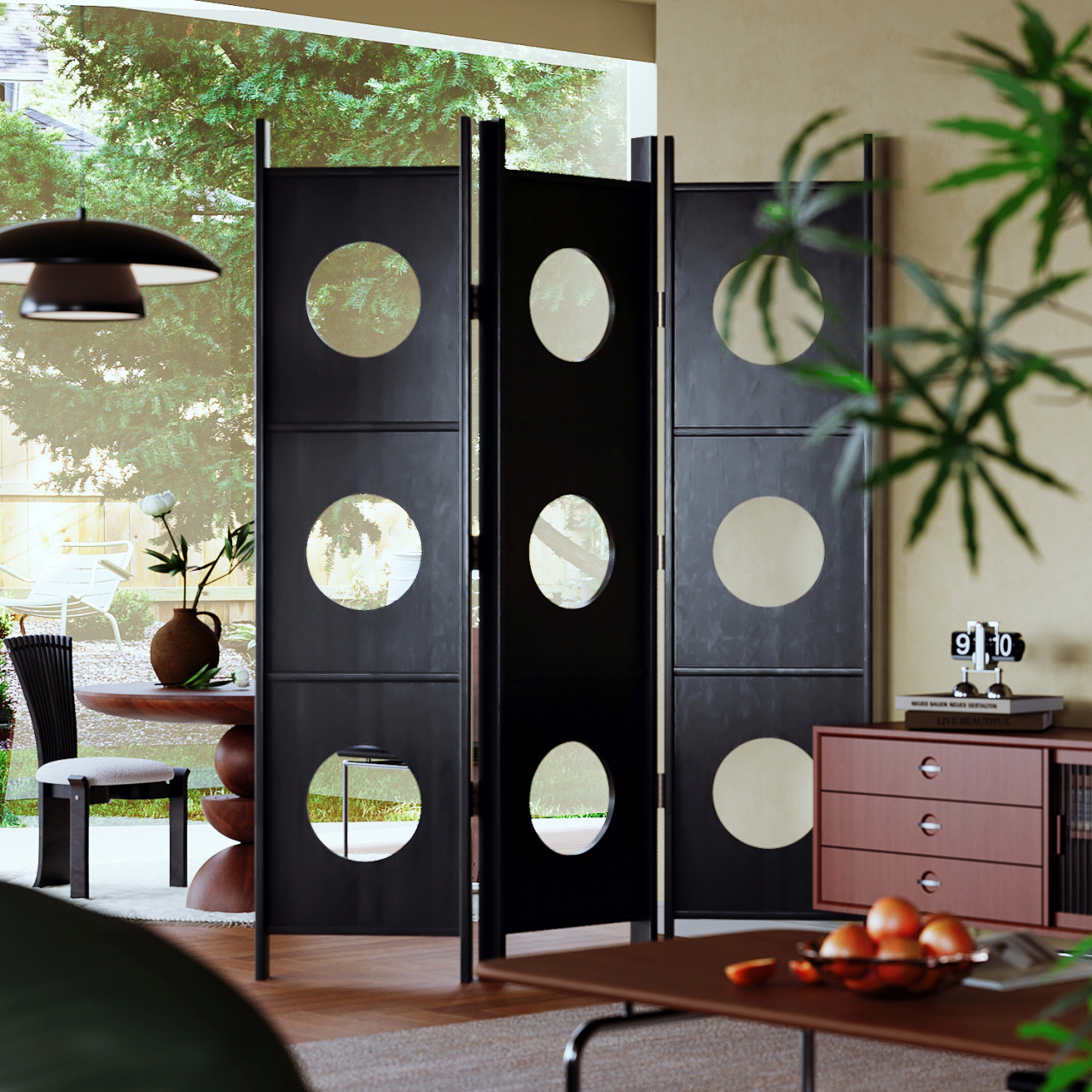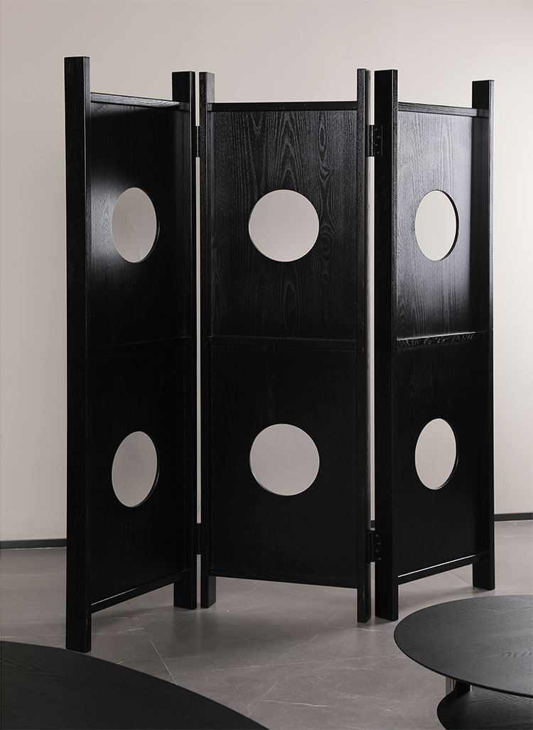 Чёткая геометрия панелей дополнена декоративными круглыми вставками, создающими ритм и визуальный баланс. Складная конструкция позволяет легко трансформировать пространство — отделить рабочую зону, спальню, гардеробную или создать приватный уголок в большом помещении.