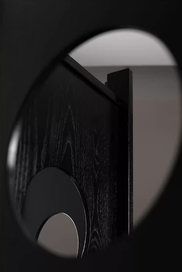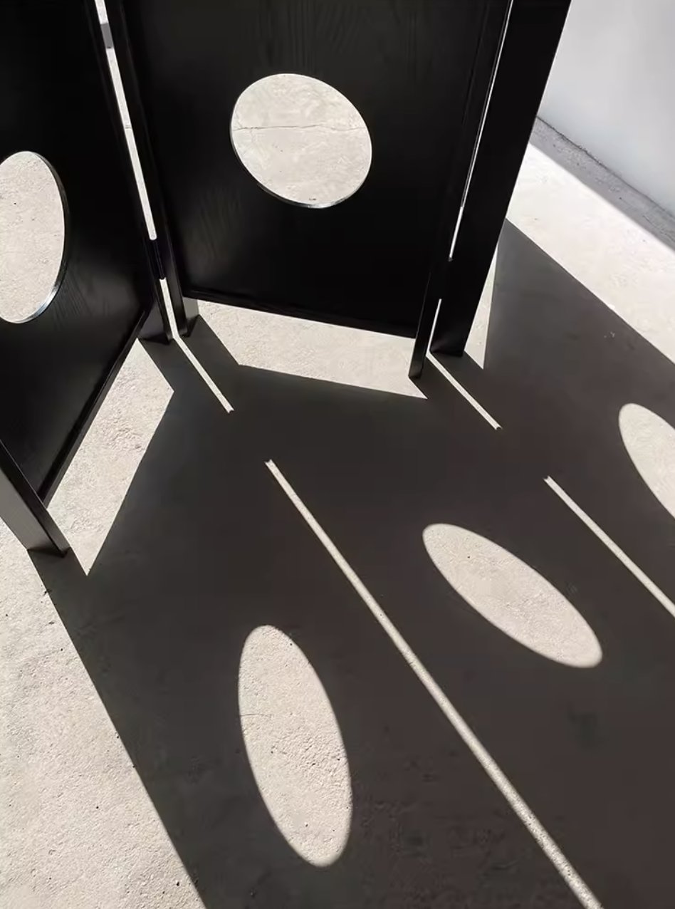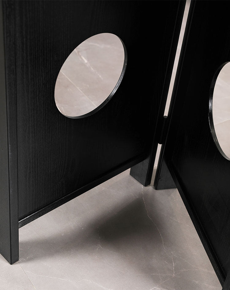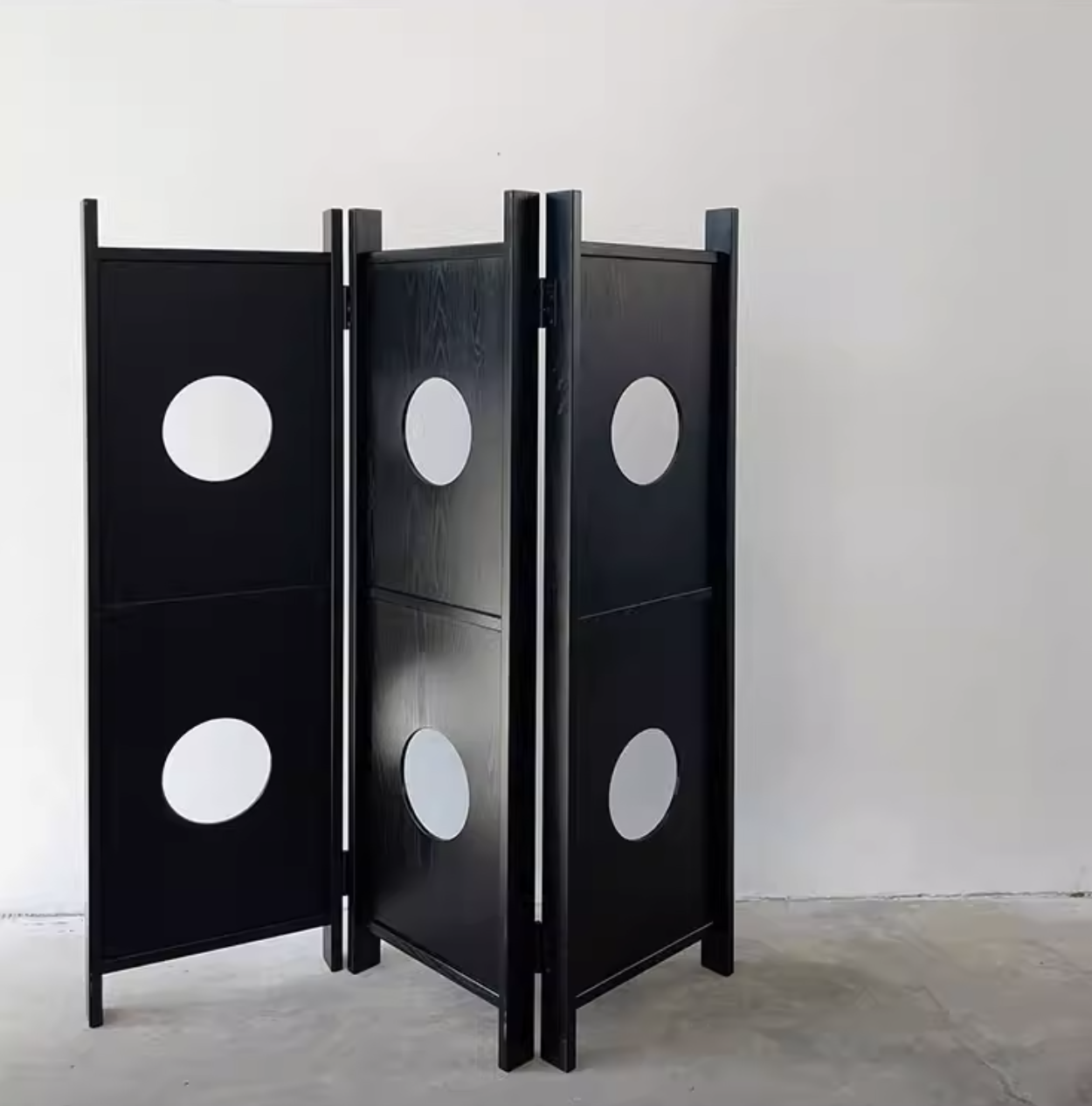 Чёткая геометрия панелей дополнена декоративными круглыми вставками, создающими ритм и визуальный баланс. Складная конструкция позволяет легко трансформировать пространство — отделить рабочую зону, спальню, гардеробную или создать приватный уголок в большом помещении.