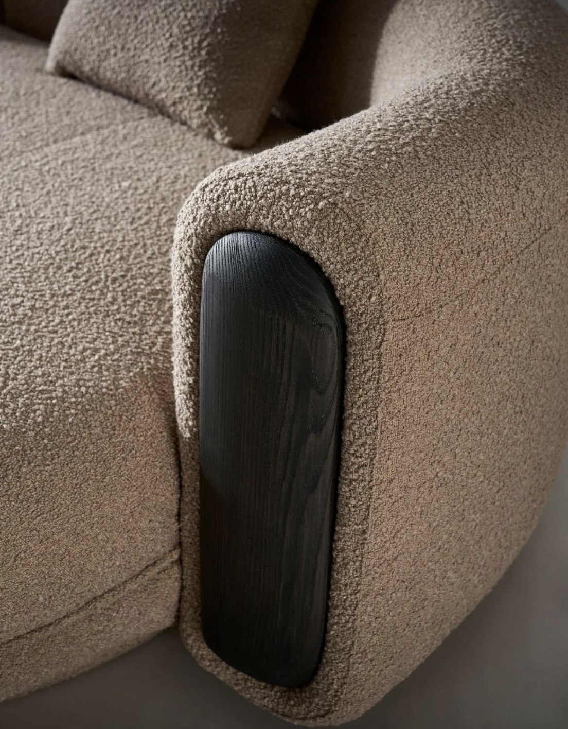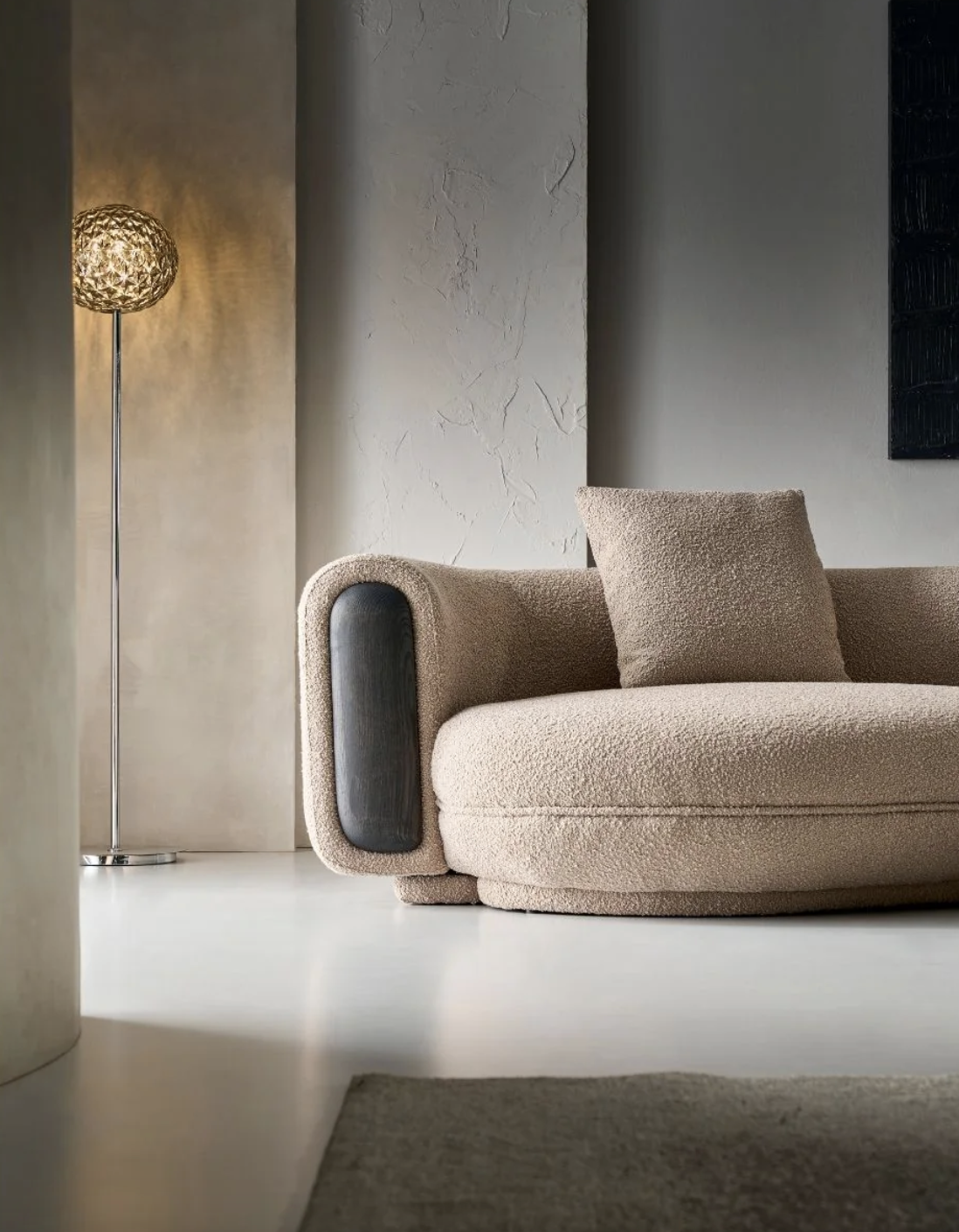 Акцентные подлокотники добавляют графичности и подчёркивают архитектуру дивана, создавая выразительный контраст фактур. Модель идеально подойдёт для просторных гостиных и лаунж-зон, органично вписываясь в интерьеры в стиле modern, soft luxury и contemporary.