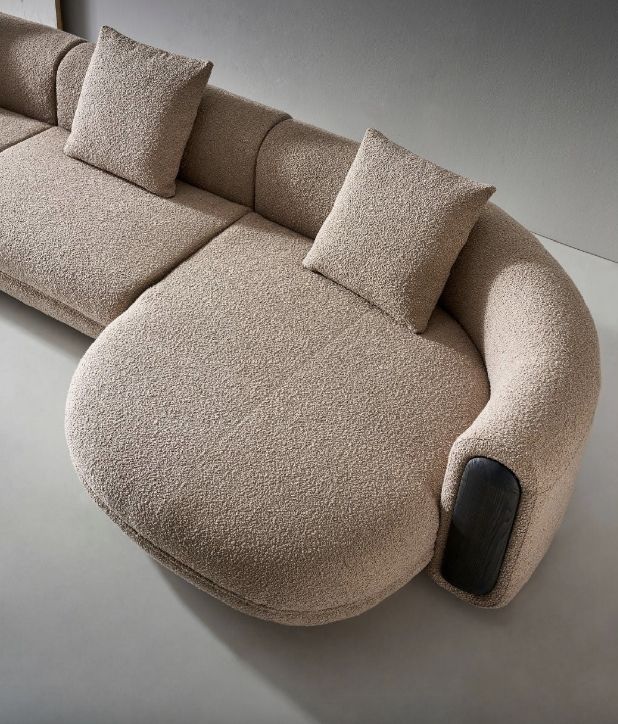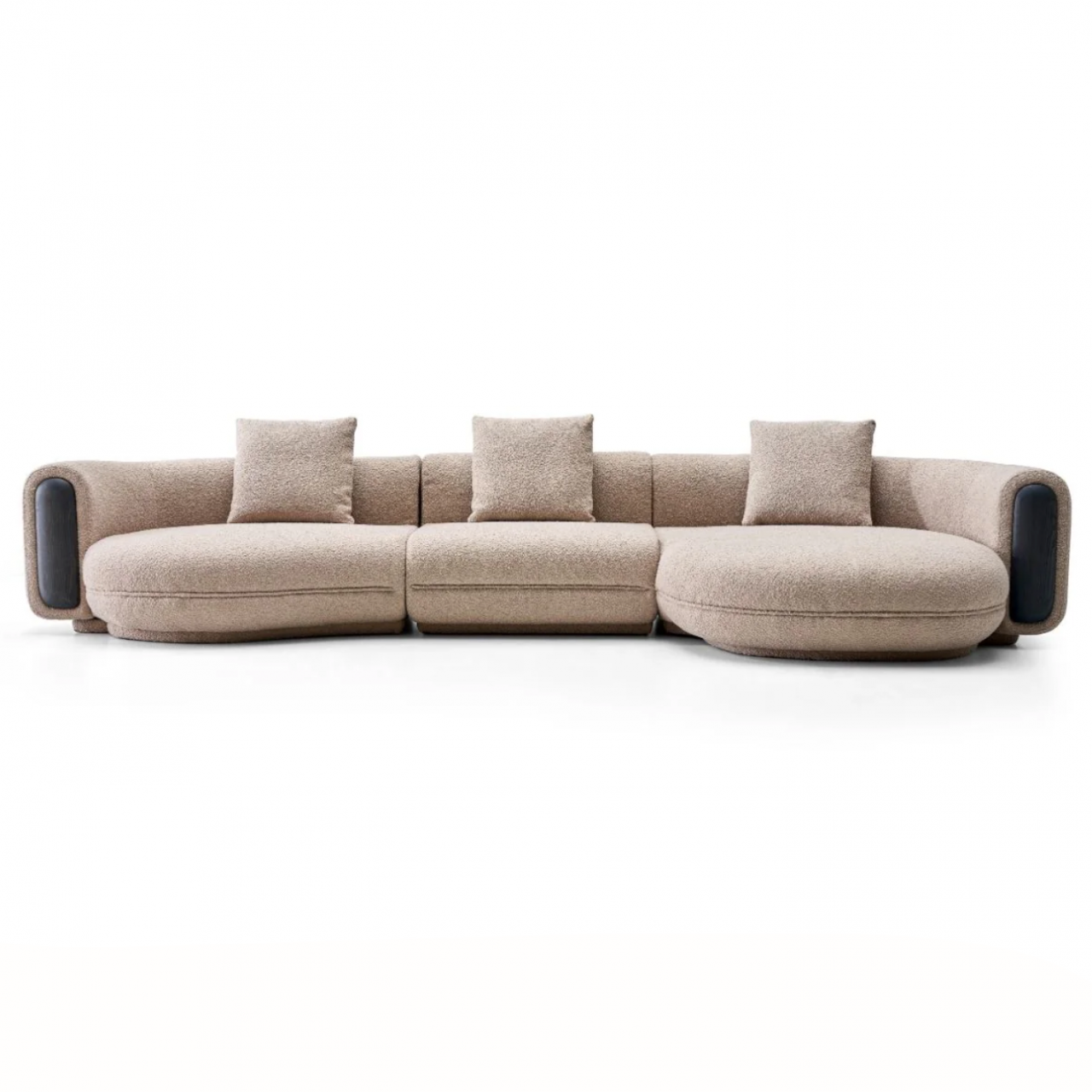 Элегантный модульный диван с мягкими, обтекаемыми формами создаёт ощущение уюта и визуального спокойствия. Глубокие сиденья и объёмные подушки обеспечивают расслабленную посадку, а округлый силуэт делает модель особенно комфортной и тактильно привлекательной.