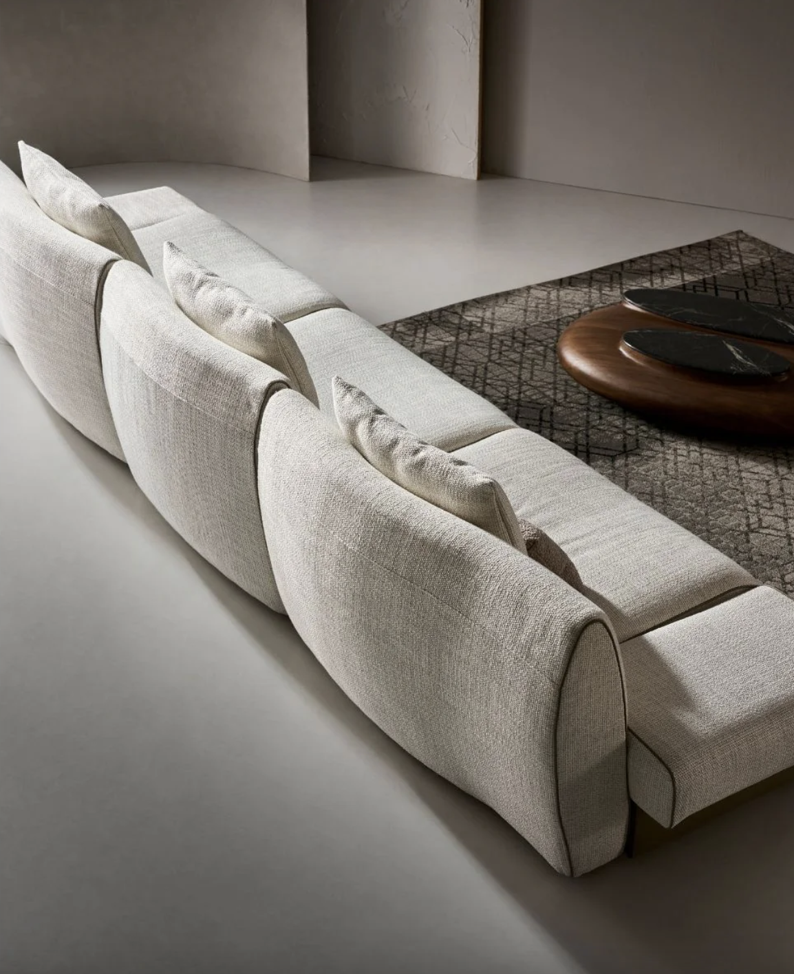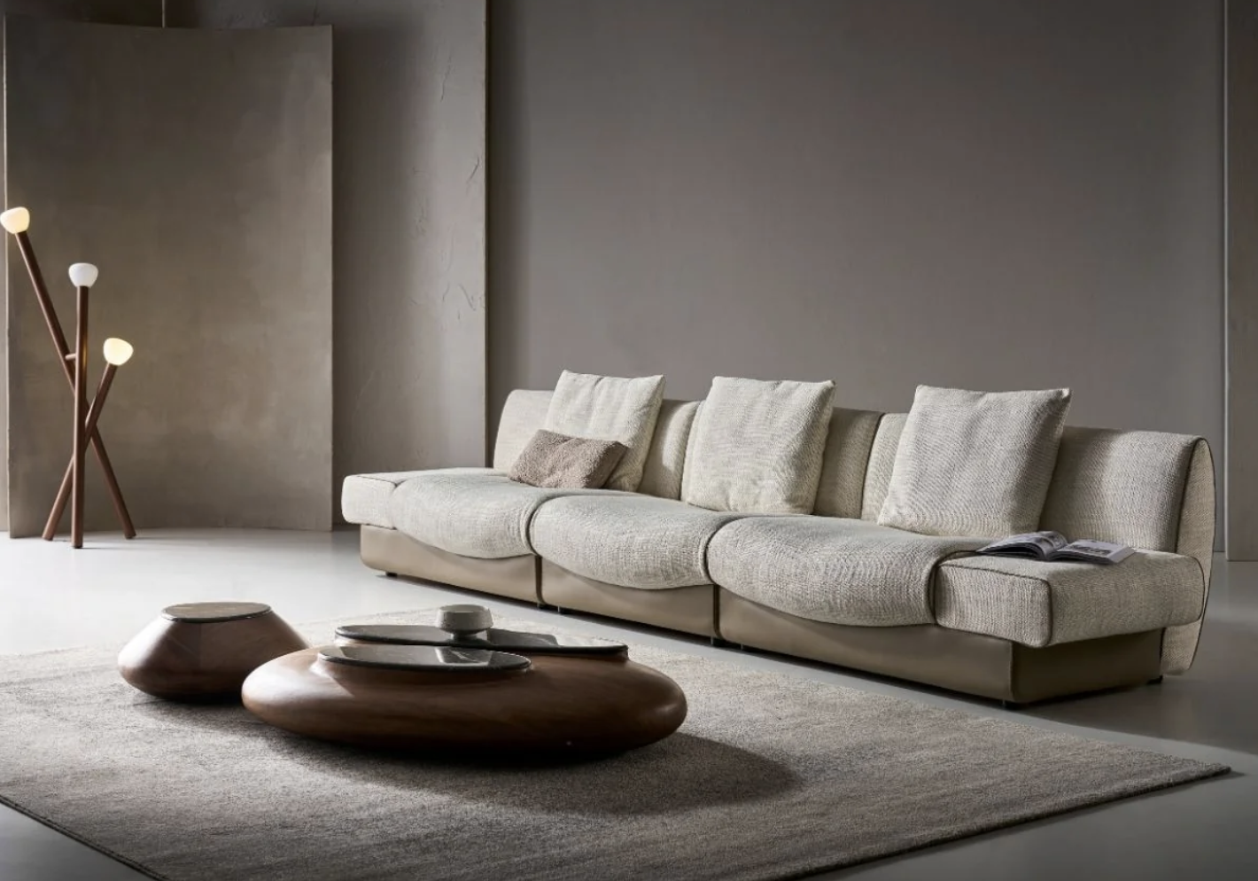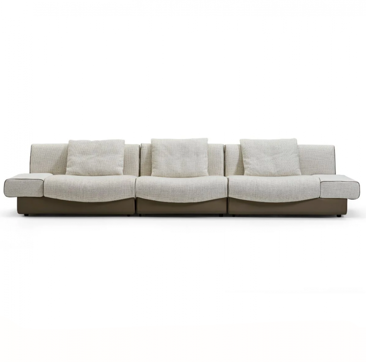 Сиденья выполнены в мягкой текстильной обивке, обеспечивающей комфорт и уют при ежедневном использовании. Подножки и нижняя часть дивана облицованы шорно-седельной кожей — прочным и выразительным материалом, который подчёркивает архитектуру формы и добавляет модели премиальный характер. Контраст фактур создаёт эффектный визуальный баланс и делает диван особенно выразительным в интерьере.