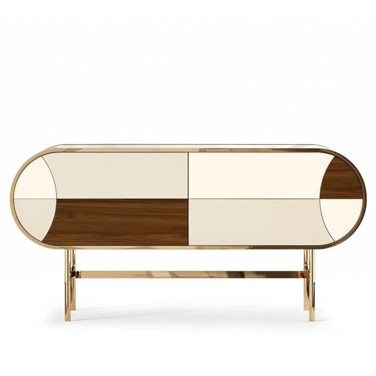 Фасады сочетают глянцевые панели и текстуру натурального дерева, придавая изделию глубину и характер. Изящное основание с металлическими элементами и латунным покрытием добавляет легкости и винтажного шарма, отсылая к эстетике середины XX века.