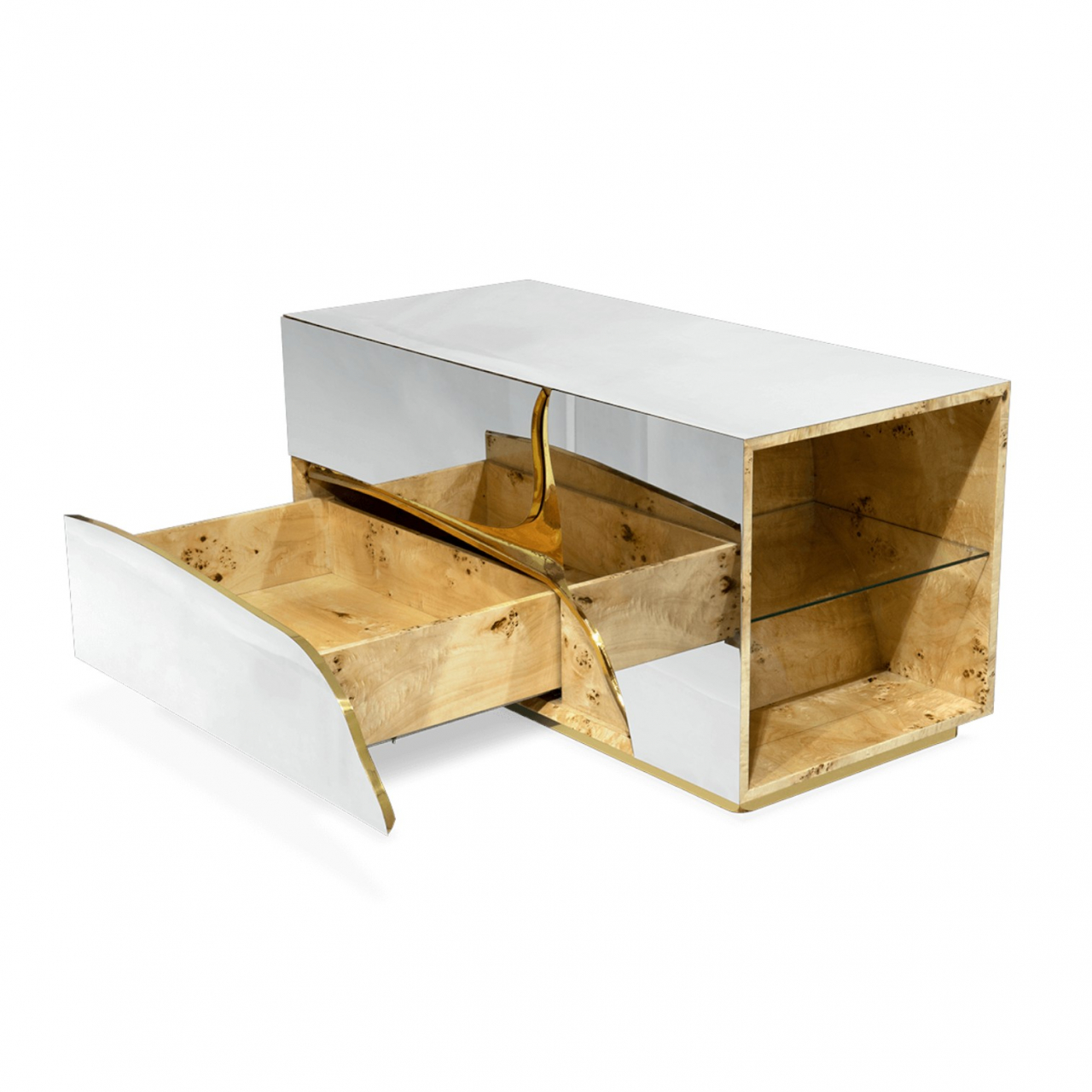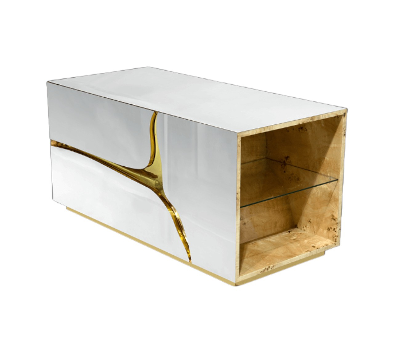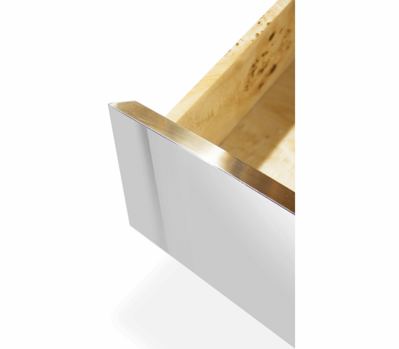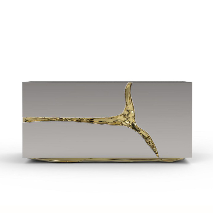 Роскошный комод из массива дерева с эффектной металлической отделкой и акцентами из золотой фольги — настоящий арт-объект для интерьера. Скульптурные линии, контраст благородного дерева и зеркального металла создают ощущение эксклюзивности и ручной работы. Вместительные ящики и открытые ниши сочетают функциональность с выразительным дизайном. Идеальный выбор для интерьеров в стиле luxury, contemporary или art-deco, где мебель становится центром внимания.