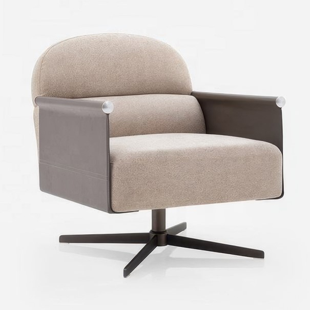 Плавные округлые линии спинки и сиденья создают уютную атмосферу, а вращающееся основание добавляет функциональности. Контраст между мягкими формами и четкими геометричными деталями подчеркивает элегантность этого кресла.