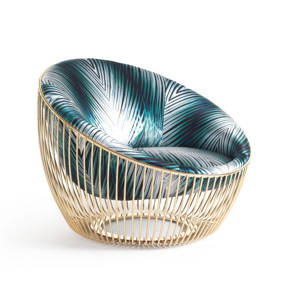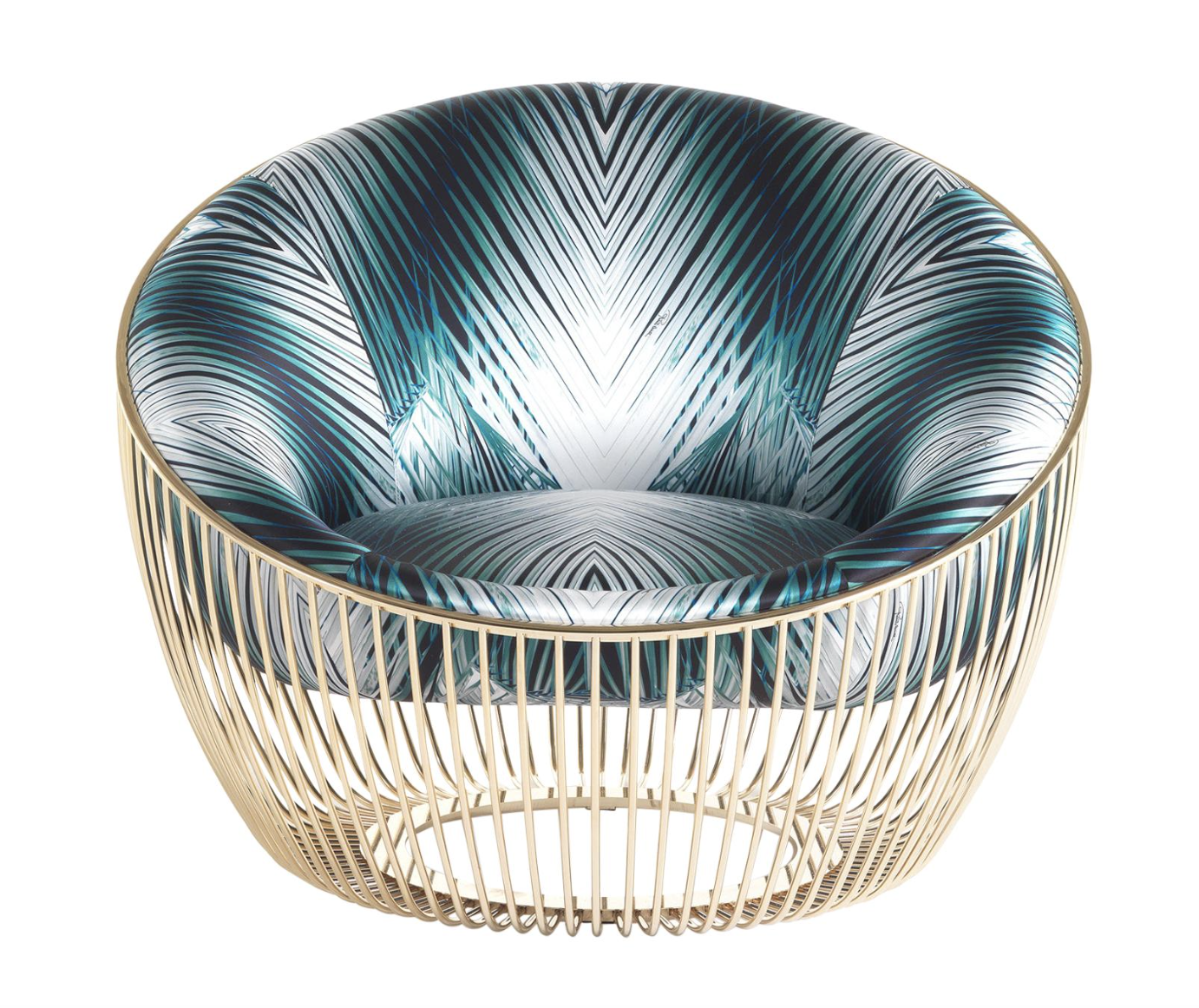 Округлая форма сиденья создаёт комфортную, обволакивающую посадку, располагающую к отдыху. Графичный текстиль с динамичным узором формирует яркий визуальный эффект и придаёт модели индивидуальность. Каркас из тонких металлических прутьев с тёплым оттенком придаёт креслу воздушность и подчёркивает современный характер дизайна. Модель станет акцентным элементом интерьера гостиной, лаунж-зоны или дизайнерского пространства.