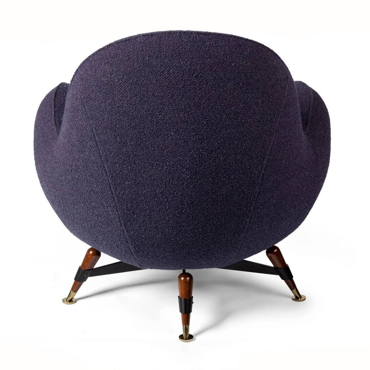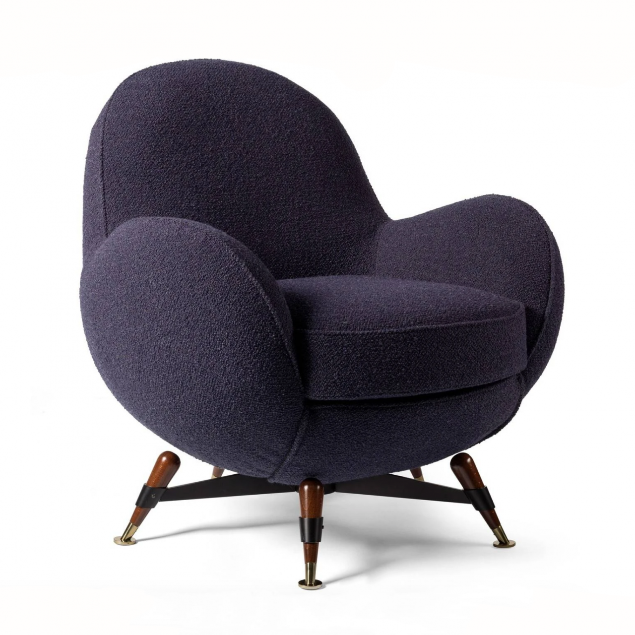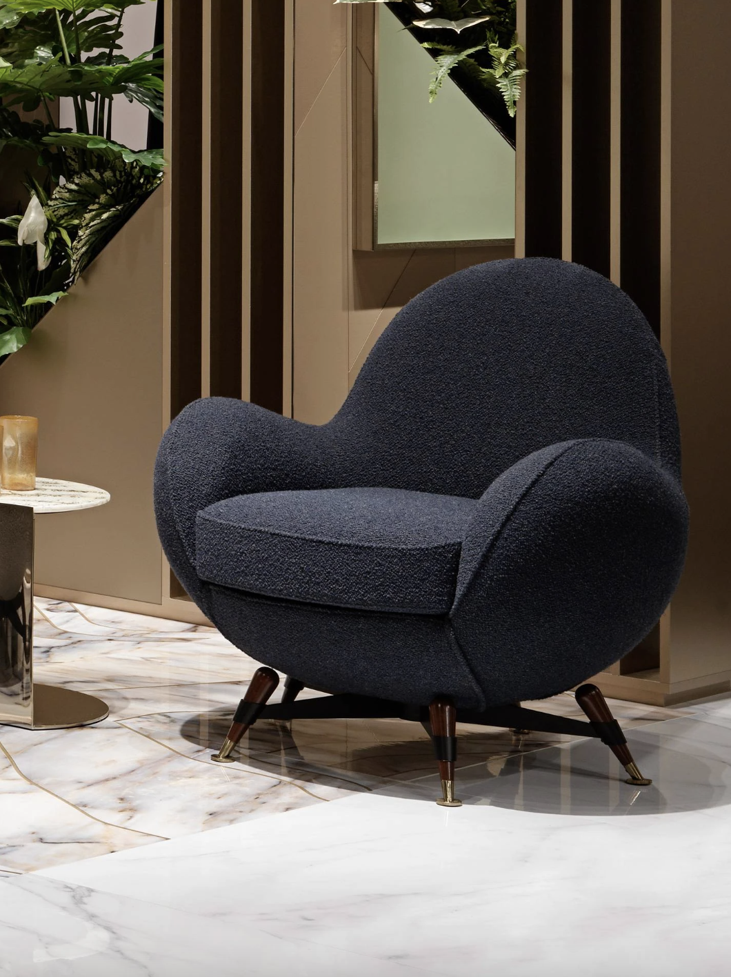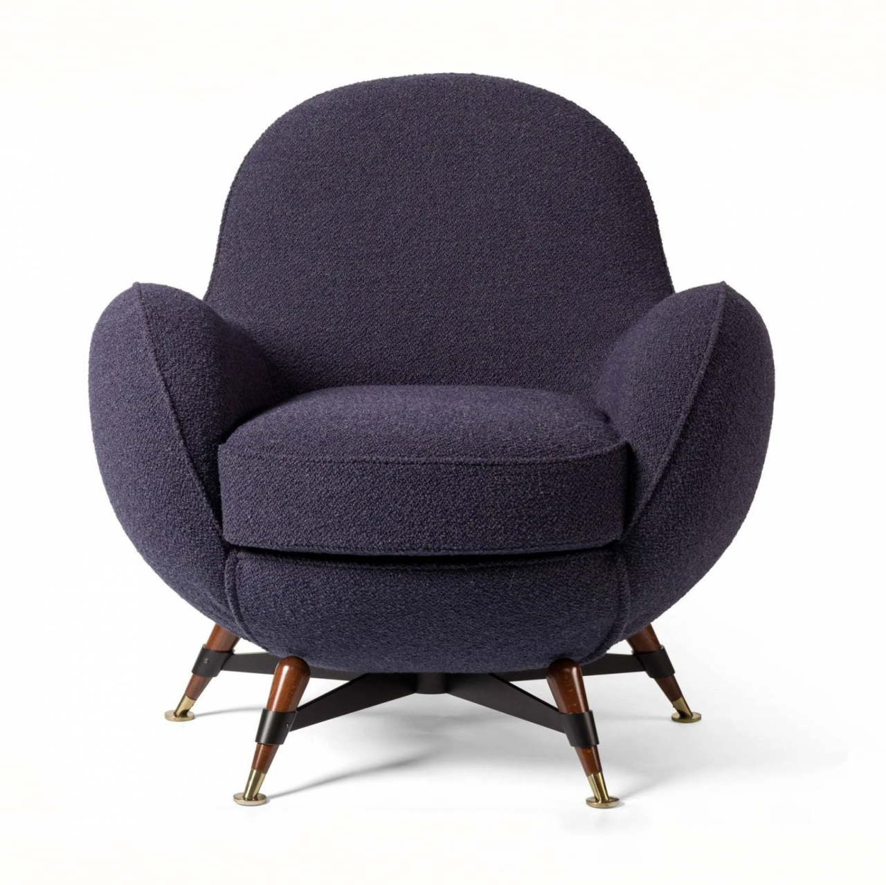Лаконичное, но выразительное кресло‑акцент: мягкие, окутывающие формы словно обнимают, а фактурная темная обивка добавляет глубину и уют. Низкая посадка и удобная широкая подушка делают его отличным местом для вечернего чтения или отдыха, а ножки из дерева с металлическими наконечниками добавляют роскошный ретро‑штрих и визуальную легкость.