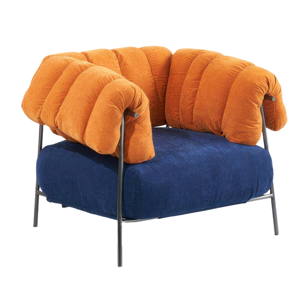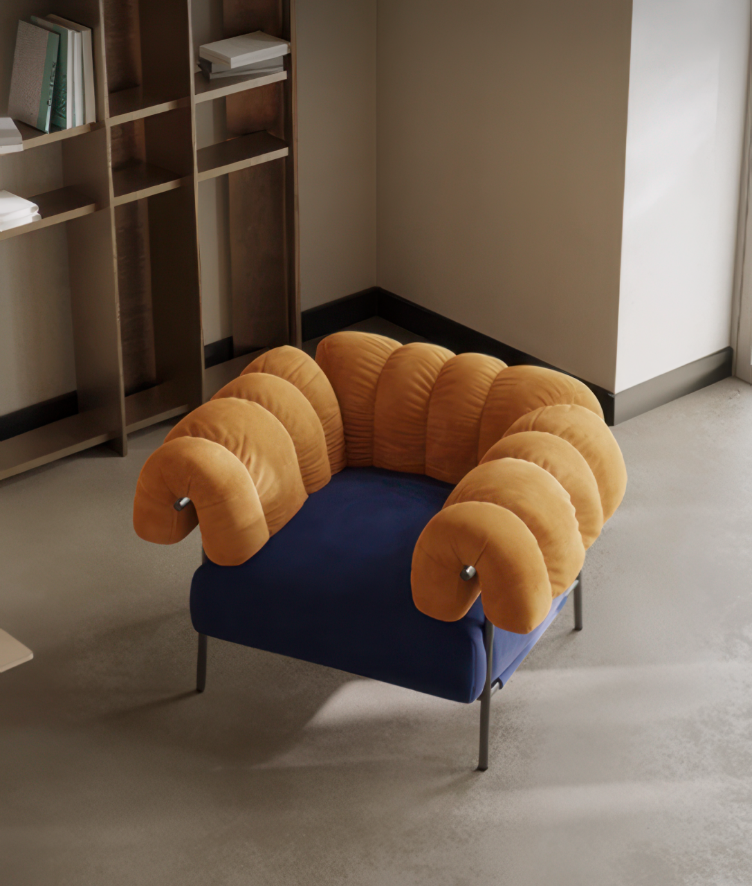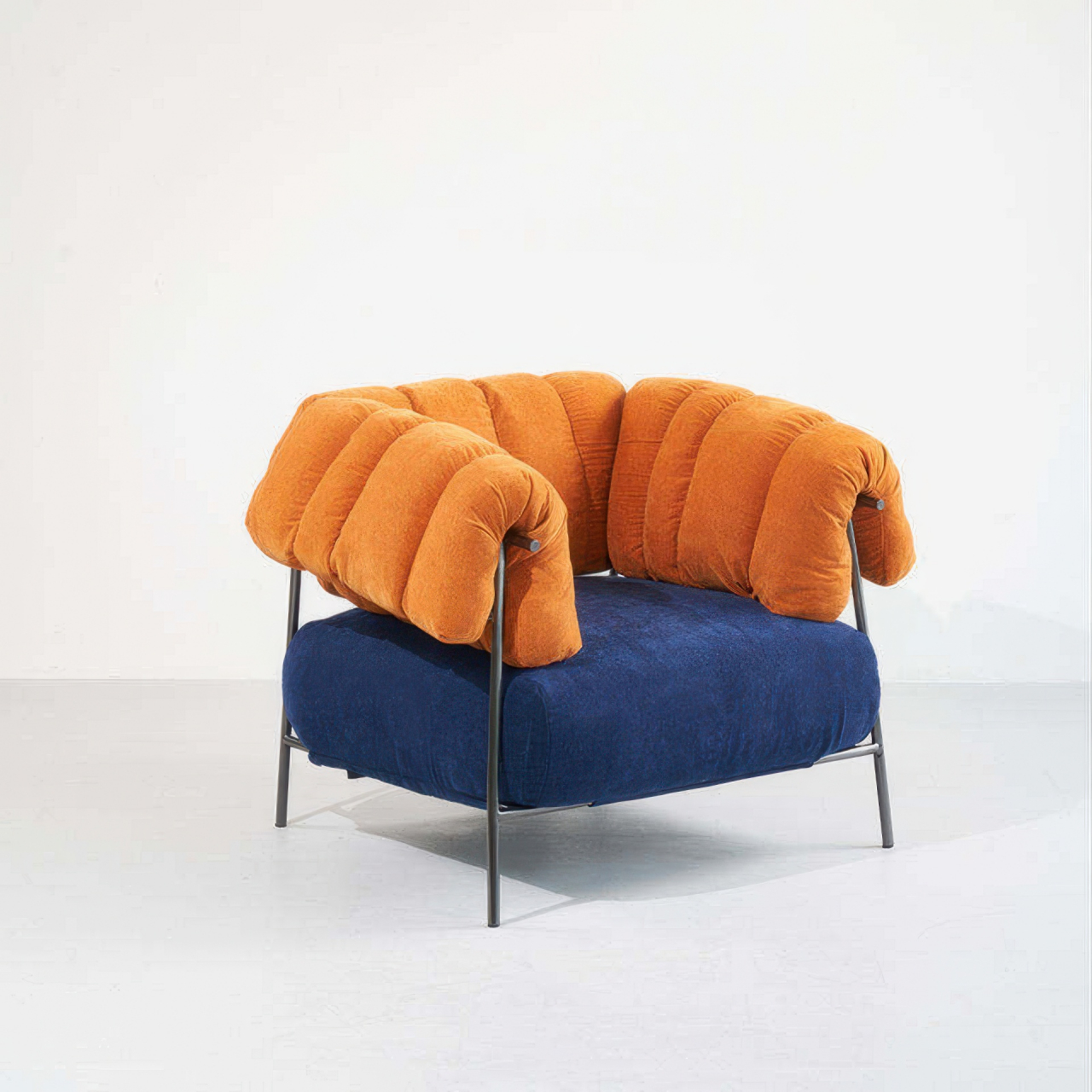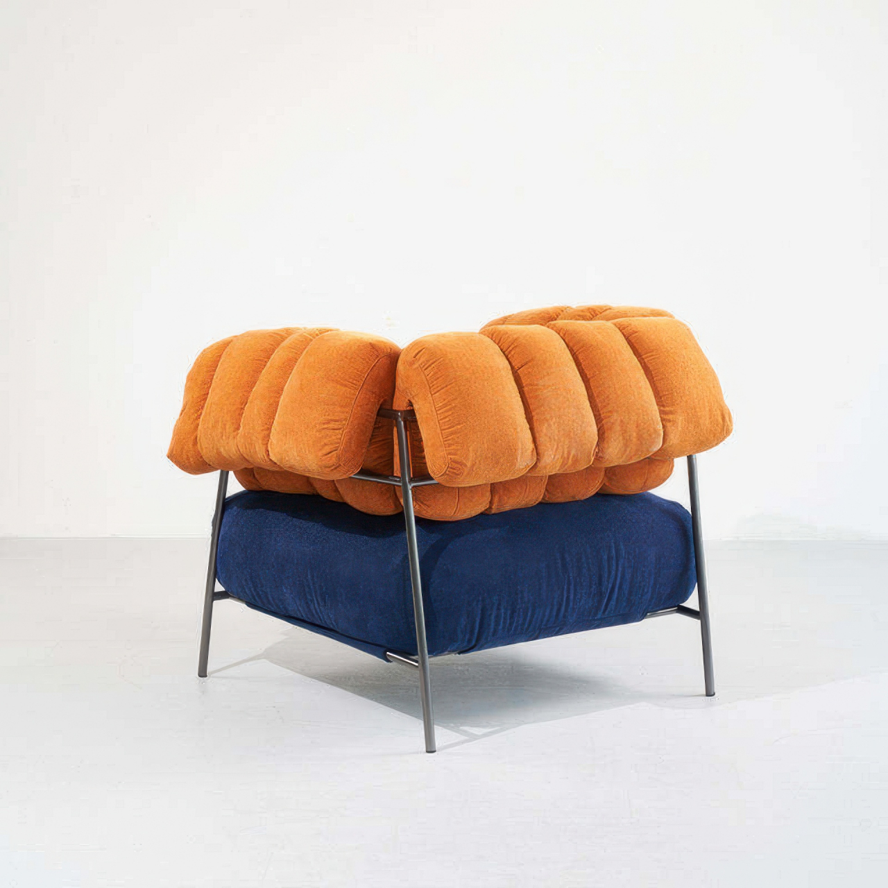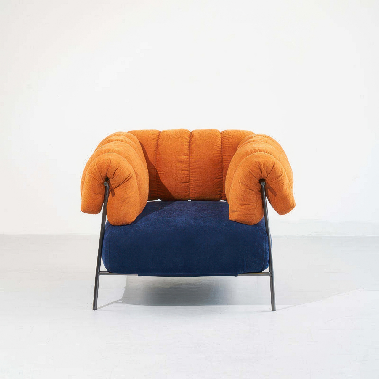 Этот необычный предмет интерьера стирает границы между функциональным дизайном и художественной инсталляцией. Его мягкие стеганые поверхности будто находятся в постоянном движении, создавая иллюзию текучести форм. Металлический каркас с асимметричными линиями добавляет динамики, превращая кресло в трехмерный эскиз.