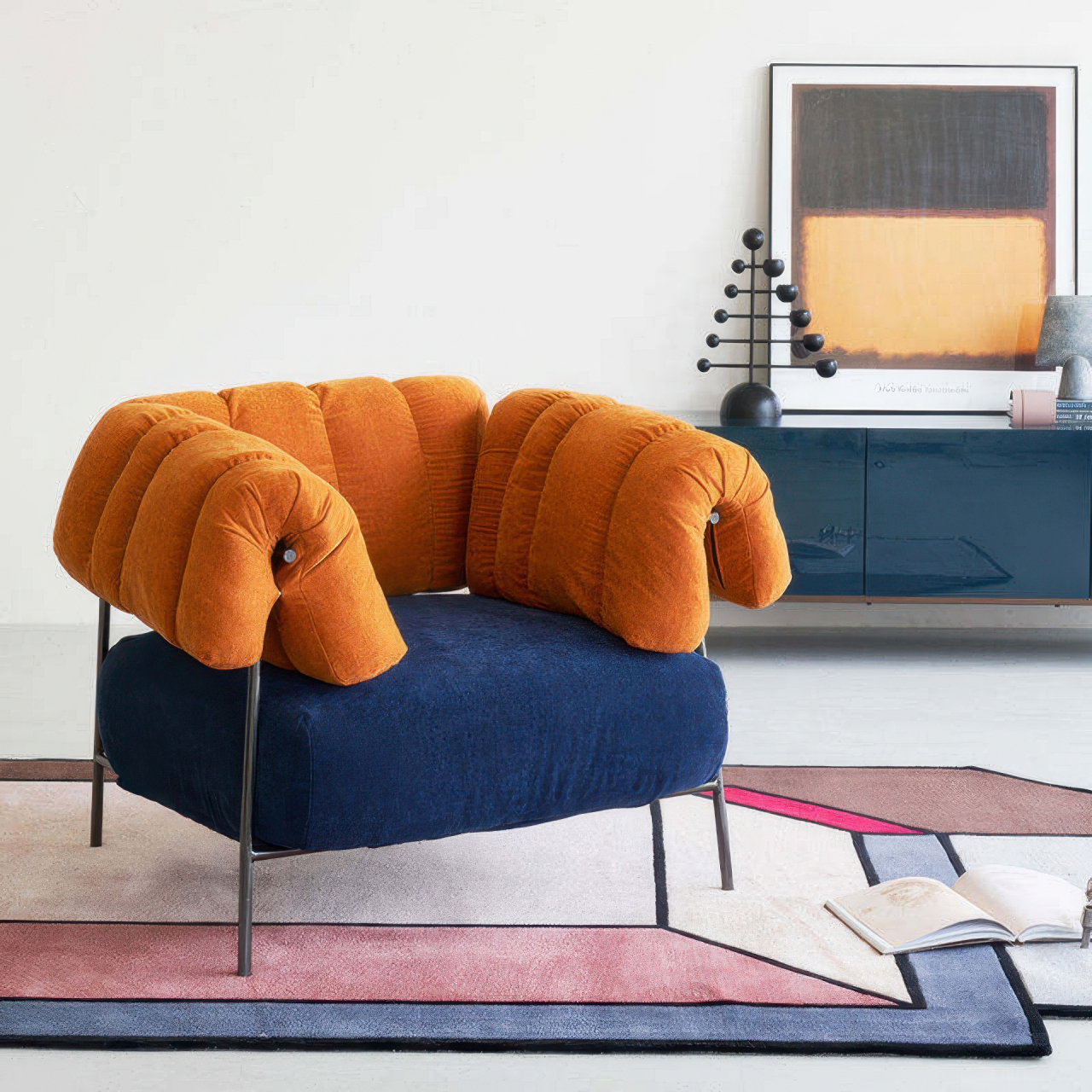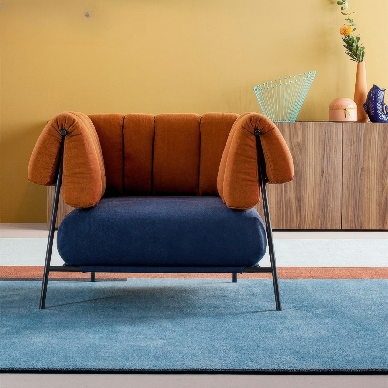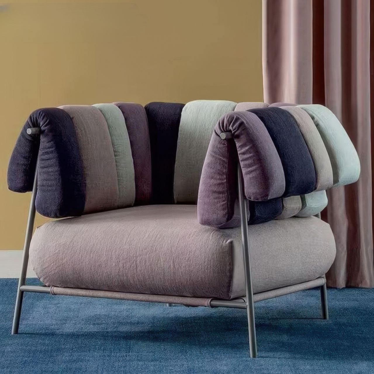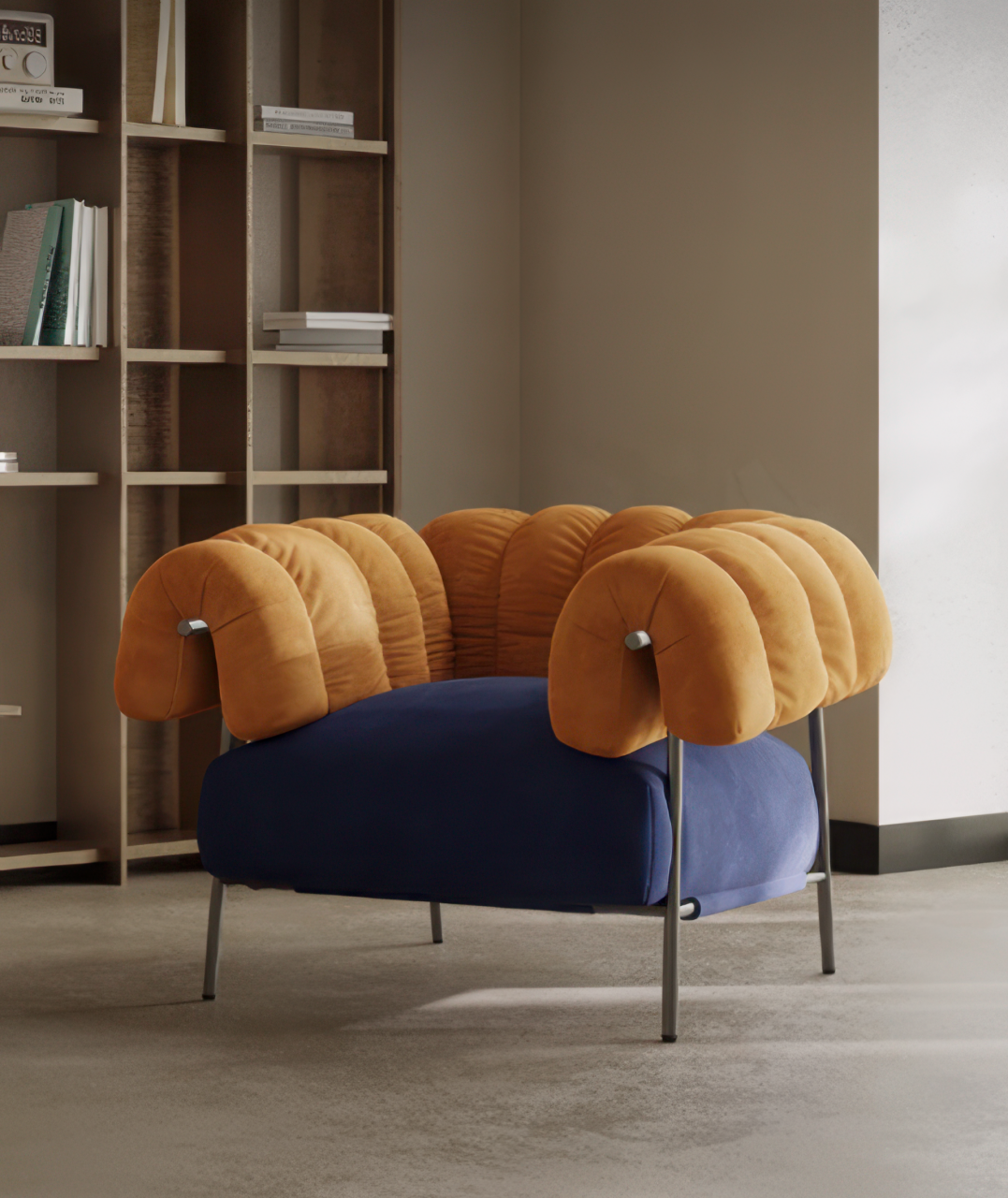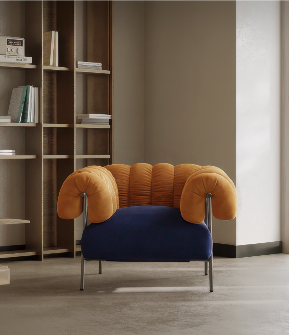 Этот необычный предмет интерьера стирает границы между функциональным дизайном и художественной инсталляцией. Его мягкие стеганые поверхности будто находятся в постоянном движении, создавая иллюзию текучести форм. Металлический каркас с асимметричными линиями добавляет динамики, превращая кресло в трехмерный эскиз.