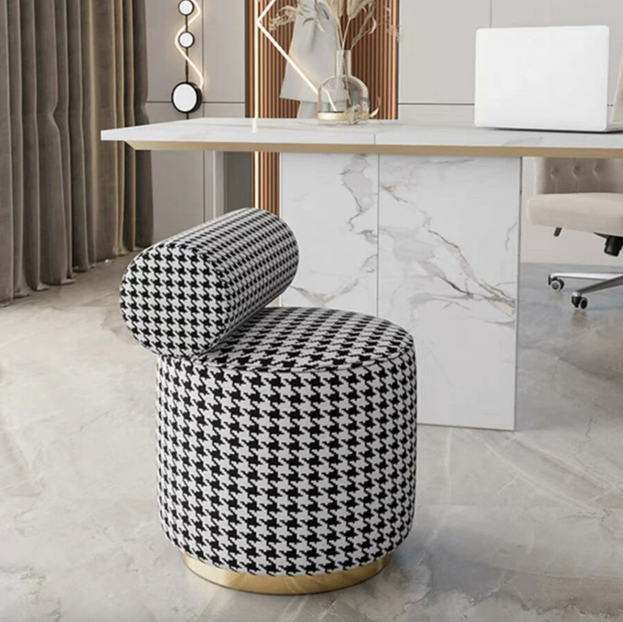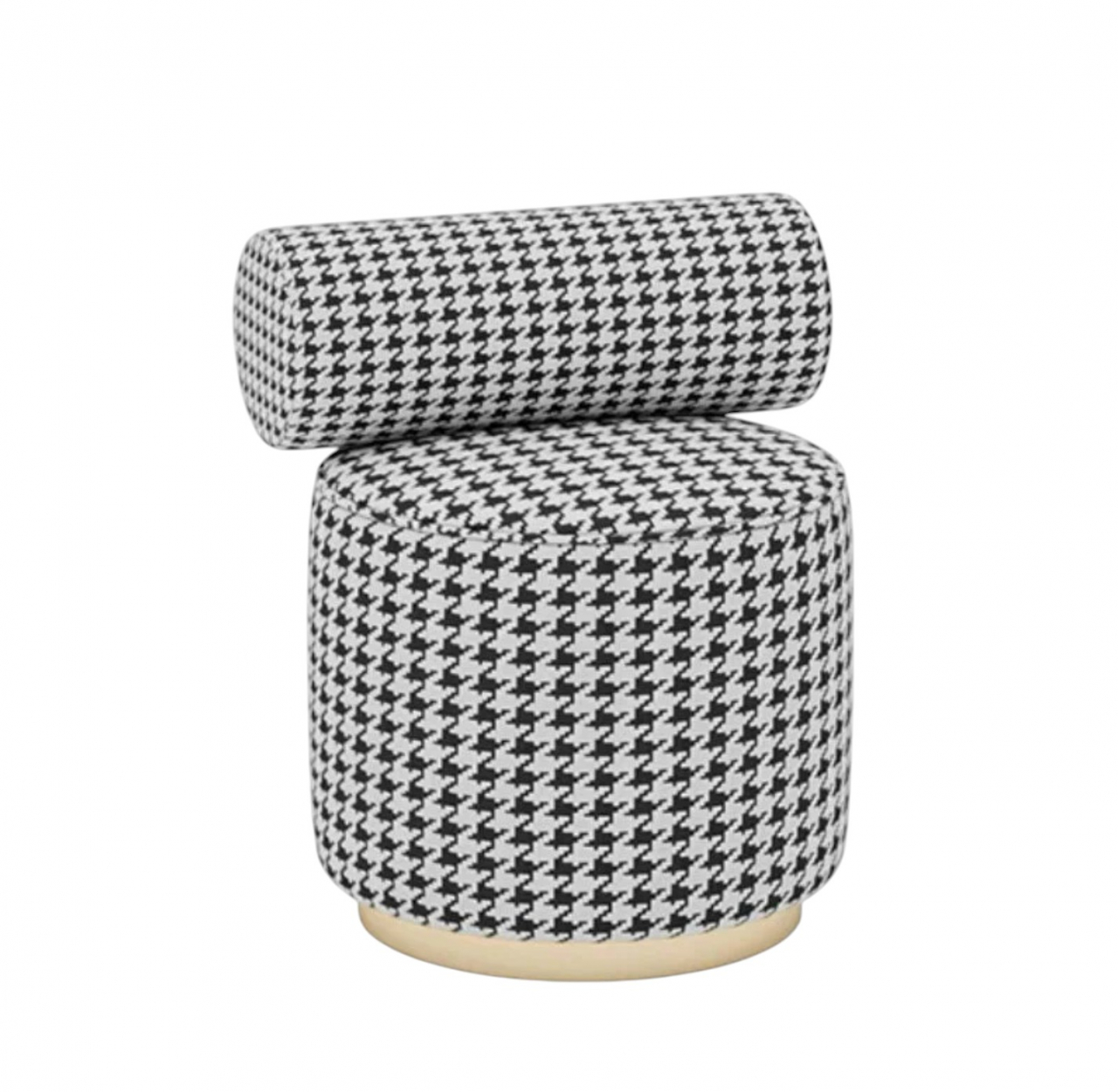 Стильный дизайнерский пуф с выразительным графическим узором — эффектное сочетание формы и текстуры. Обивка с классическим принтом «гусиная лапка» придаёт модели характер и визуальную динамику, а мягкая цилиндрическая спинка обеспечивает комфортную поддержку. Компактный размер делает пуф универсальным: он подойдёт для гостиной, спальни или зоны отдыха, легко дополняя интерьер в стиле modern, art-deco или mid-century. Отличный акцент, который сразу притягивает взгляд.