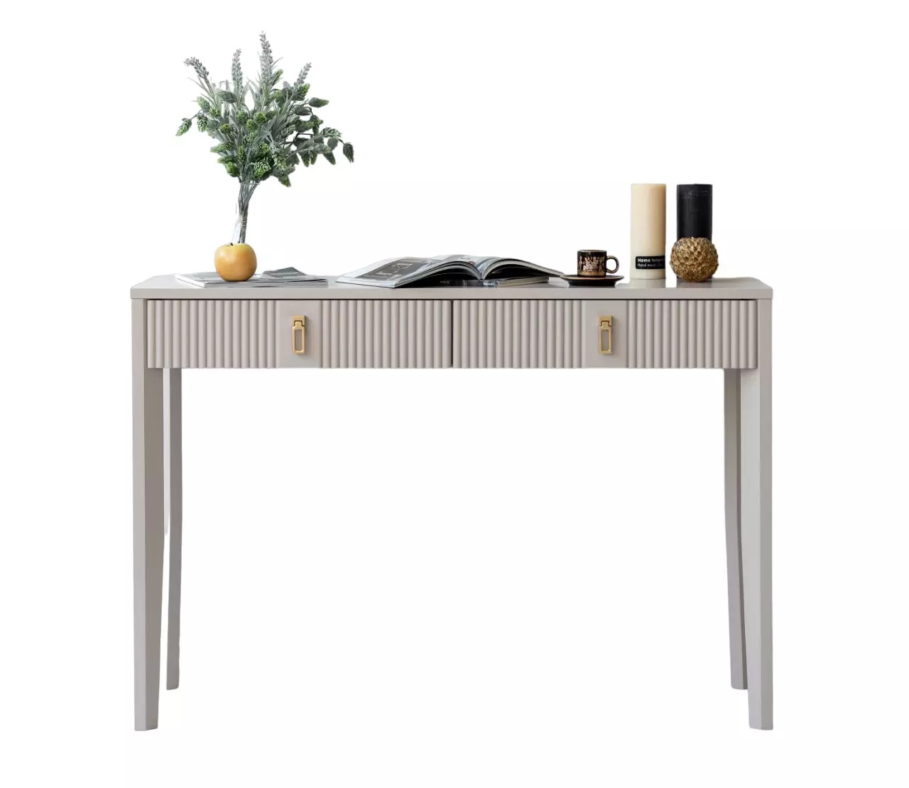 Консоль Apox — функциональный и при этом изысканный предмет обстановки прихожей, спальни или гостиной. Столик оборудован двумя выдвижными ящиками. Ножки изготовлены из массива бука. Оригинальность модели — рифленый фасад, который добавляет объём изделию и подчеркивает элегантность.