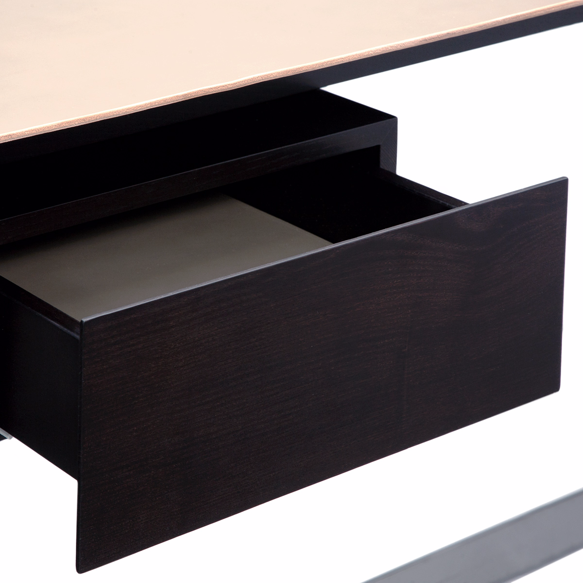 Металлическая столешница обтянута шорно-седельной кожей — плотной, фактурной и долговечной. Этот материал используется в премиальном сегменте благодаря своей износостойкости и благородному внешнему виду. Со временем кожа приобретает ещё более выразительный характер, формируя естественную патину.