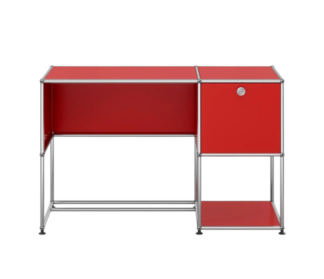 Каркас выполнен из оцинкованной стали — материал устойчив к коррозии, механическим воздействиям и рассчитан на длительную эксплуатацию. Чёткие линии и открытая конструкция подчёркивают современный стиль, а встроенный модуль с дверцей позволяет удобно организовать хранение документов и личных вещей.