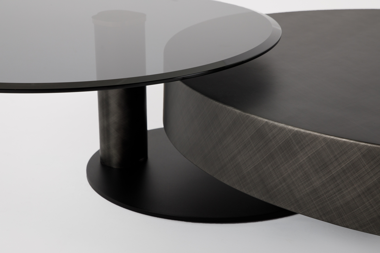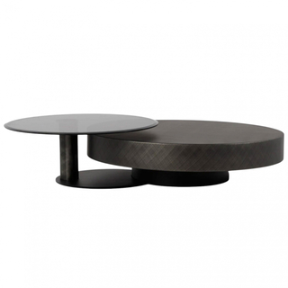 Стол с круглой столешницей и матовым металлическим покрытием на низком основании, дополненный компактным асимметричным столиком со стеклянной столешницей и цилиндрической опорой. Продуманная композиция сочетает элегантность и функциональность, создавая гармоничный ансамбль для гостиной. Четкие линии и контраст материалов подчеркивают лаконичную эстетику, а многоуровневая конструкция добавляет интерьеру динамики. Идеальное решение для ценителей аккуратного, стильного пространства с продуманными деталями.