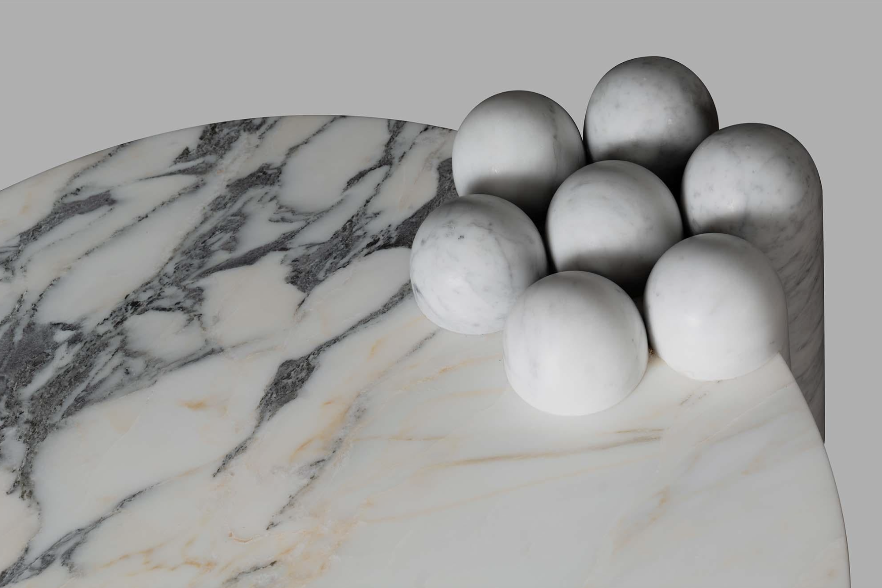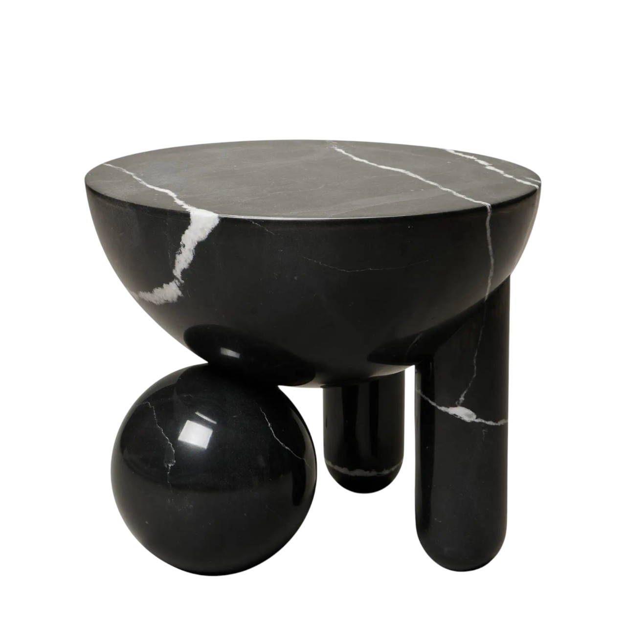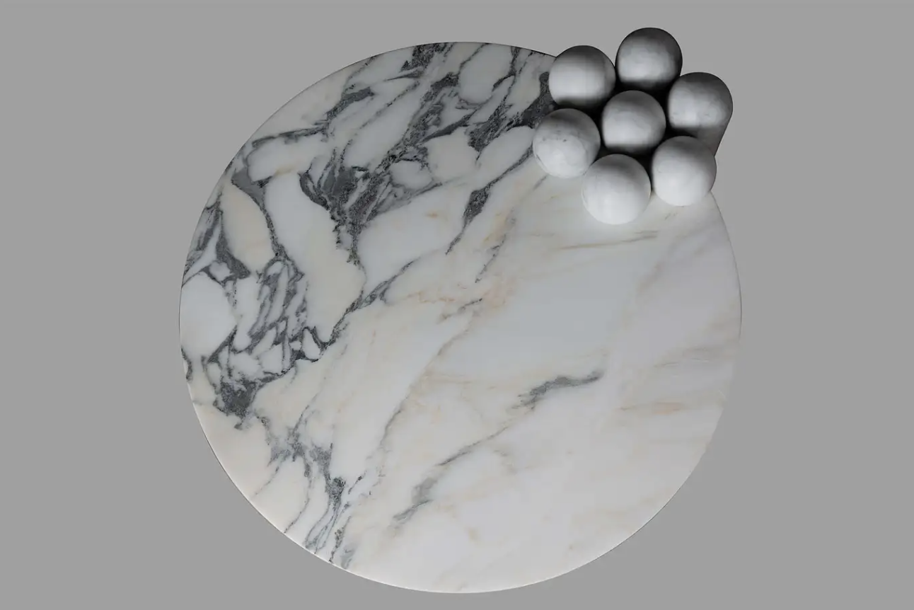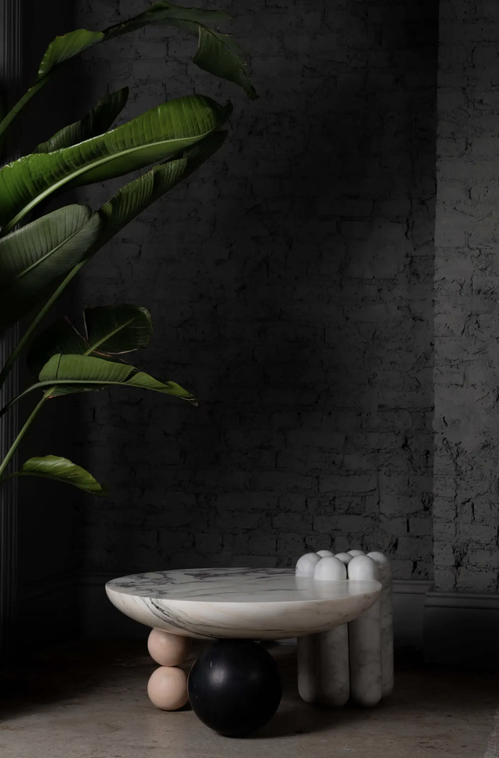 Чашеобразная столешница плавных очертаний поддерживается двумя цилиндрическими ножками разной высоты, создавая динамичный силуэт. Рядом расположена крупная сферическая подставка, дополняющая композицию. Гармония мягких линий и монохромной гаммы делает эту модель универсальным элементом интерьера. Идеально подходит для использования в гостиных, холлах или минималистичных пространствах, сочетая функциональность с художественной выразительностью.