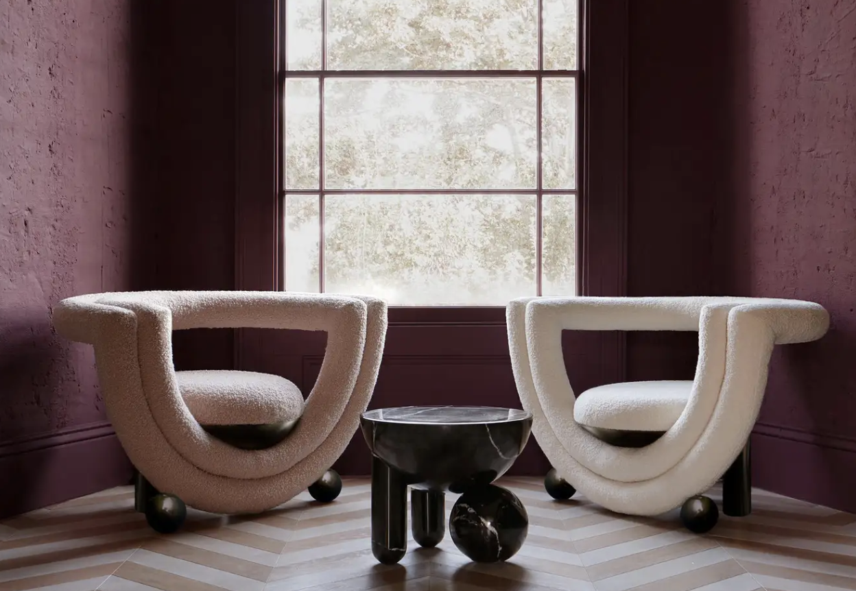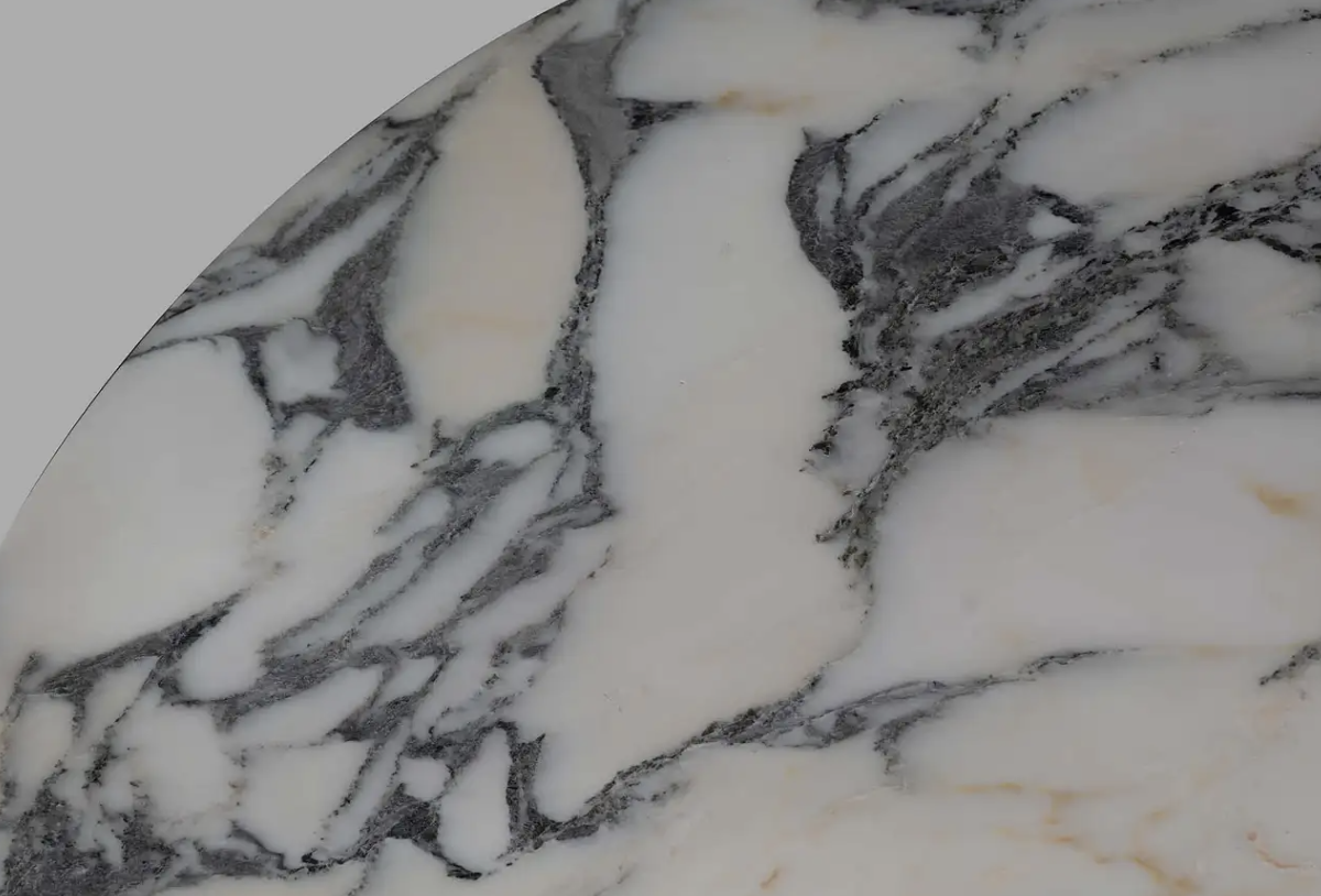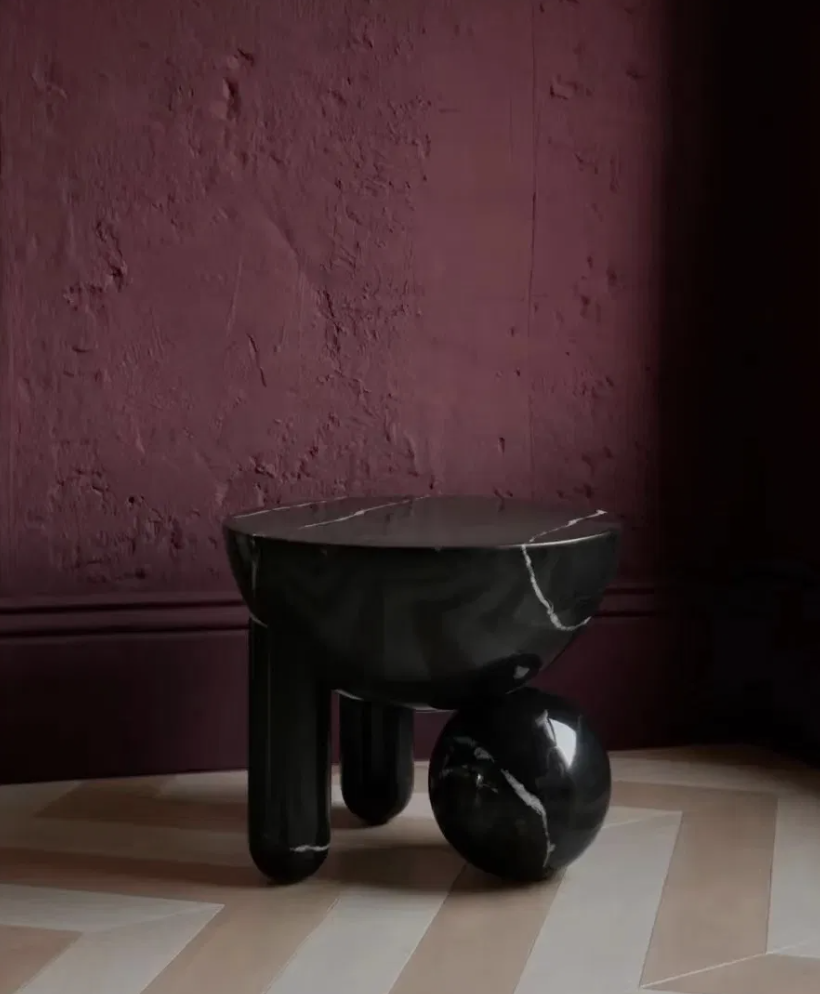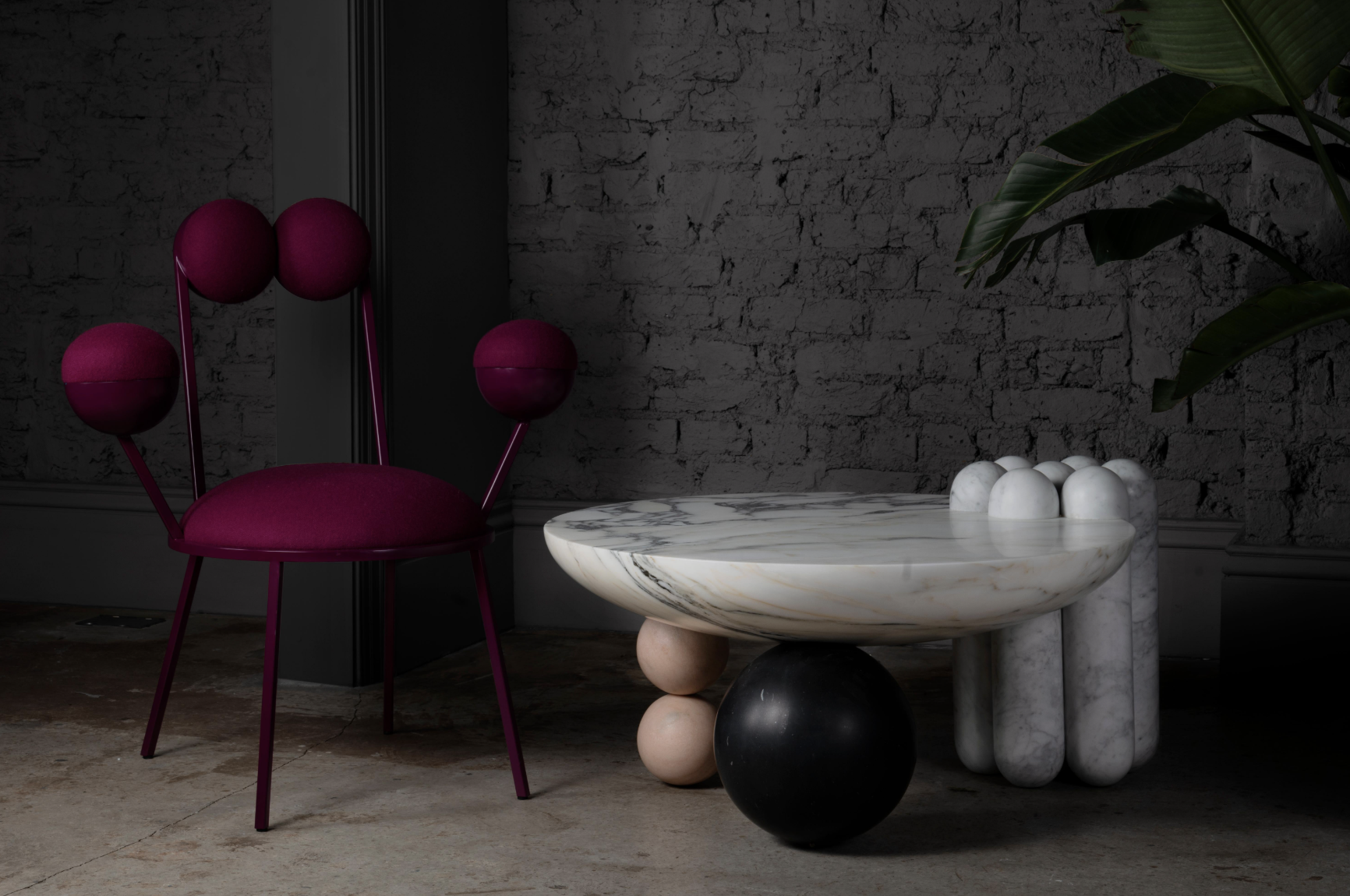 Чашеобразная столешница плавных очертаний поддерживается двумя цилиндрическими ножками разной высоты, создавая динамичный силуэт. Рядом расположена крупная сферическая подставка, дополняющая композицию. Гармония мягких линий и монохромной гаммы делает эту модель универсальным элементом интерьера. Идеально подходит для использования в гостиных, холлах или минималистичных пространствах, сочетая функциональность с художественной выразительностью.