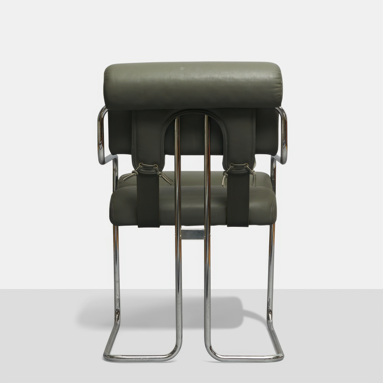 Четкие прямые линии и бескомпромиссная геометрия — это кресло воплощает квинтэссенцию стиля Баухаус. Плоская кожаная спинка строгой формы подчеркивает философию «форма следует за функцией», предлагая комфорт без лишних деталей. Жесткий каркас с открытой конструкцией визуально облегчает форму, сохраняя абсолютную устойчивость.