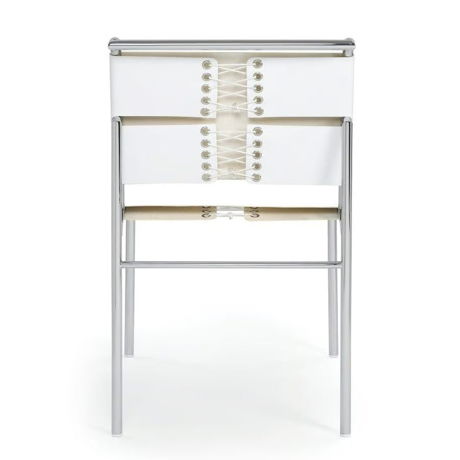 Прочный металлический каркас с хромированным покрытием обеспечивает устойчивость и долговечность, а сиденье и спинка выполнены из качественной искусственной кожи, которая легко сочетается с любыми отделочными материалами — от бетона и камня до дерева и текстиля.