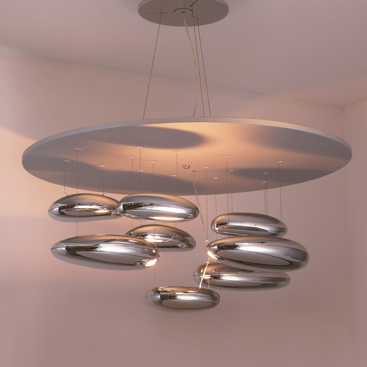 Люстра с футуристичным силуэтом и эффектной многоуровневой композицией. Гладкие плафоны в форме «парящих» дисков создают ощущение лёгкости и динамики, формируя мягкий рассеянный свет и выразительную игру отражений.