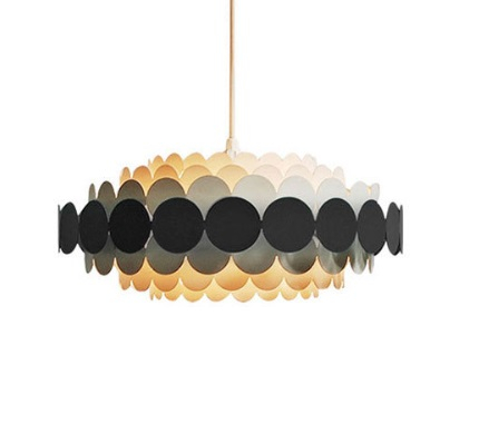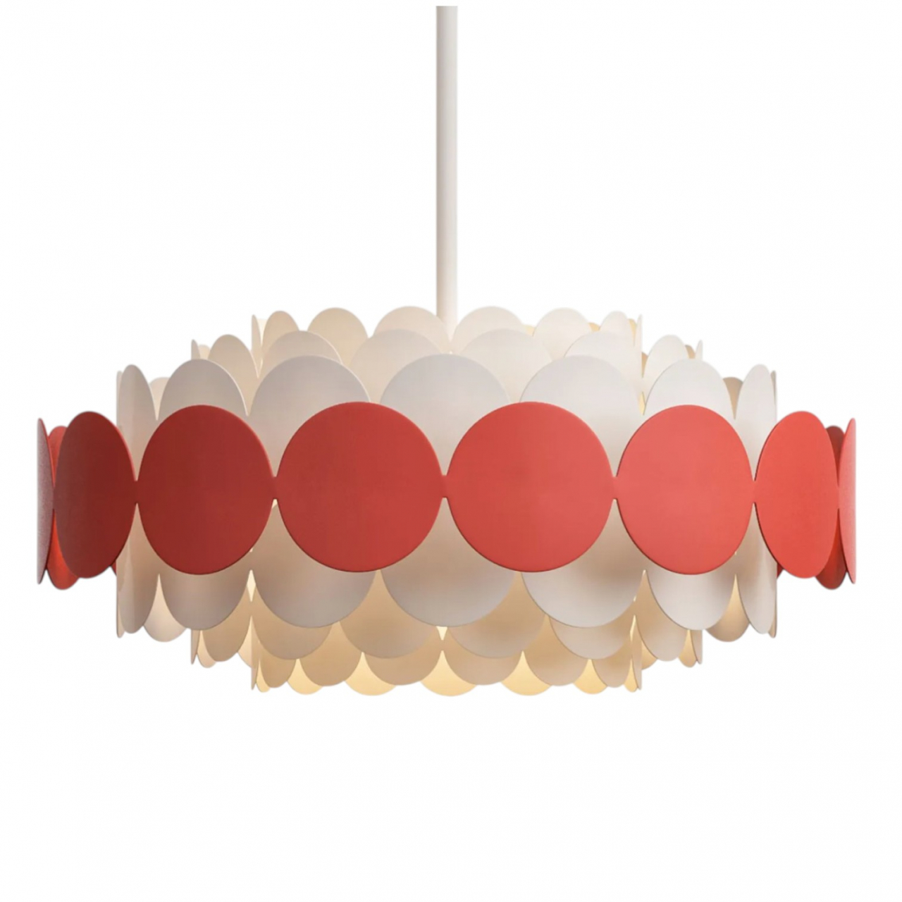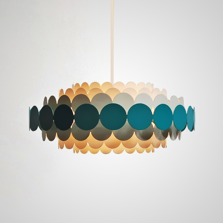 Подвесной светильник с декоративным плафоном из многослойных круглых элементов — яркий акцент в современном интерьере. Чередование полупрозрачных и насыщенных цветных дисков создает динамичную композицию и мягкую игру света, наполняя пространство теплым и уютным сиянием.