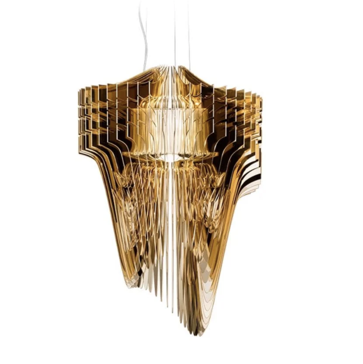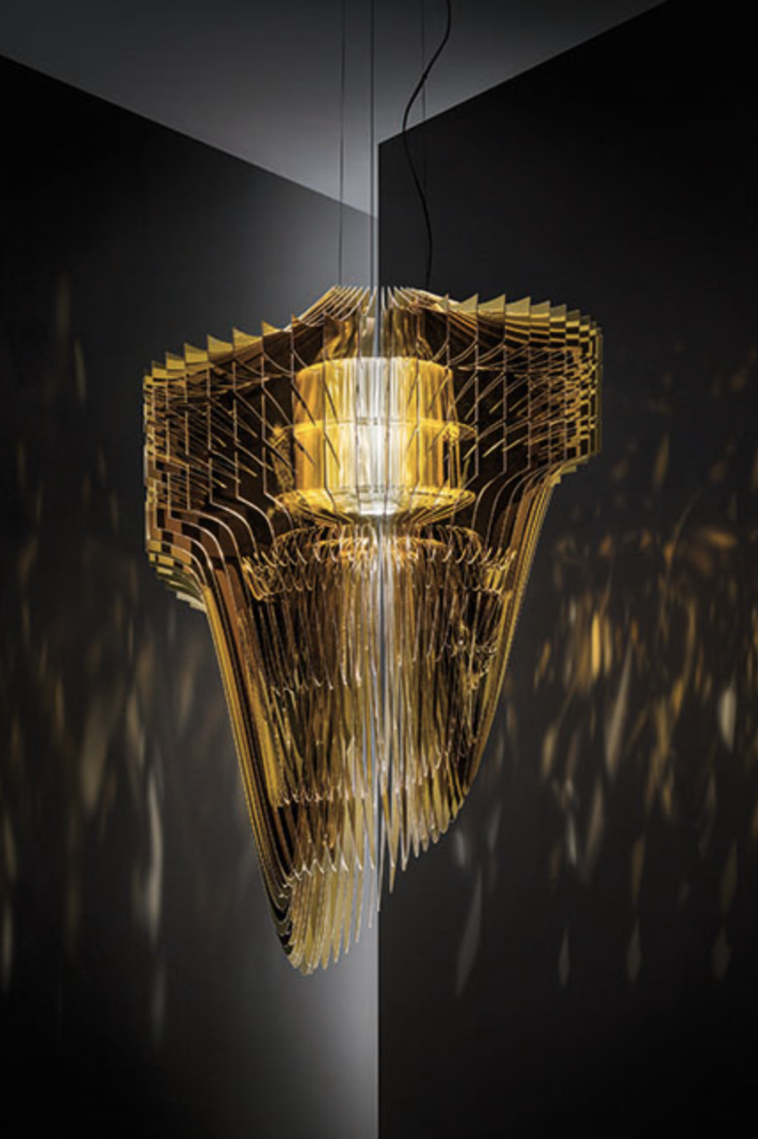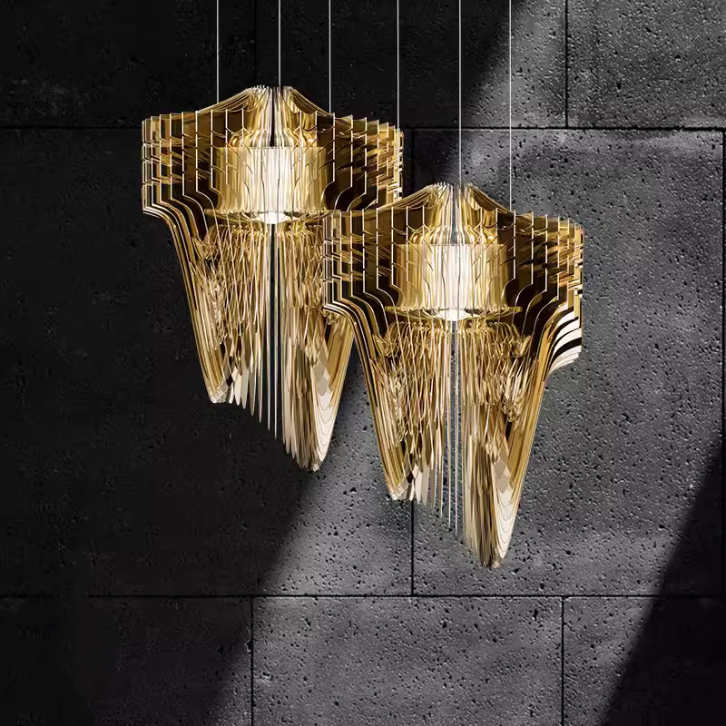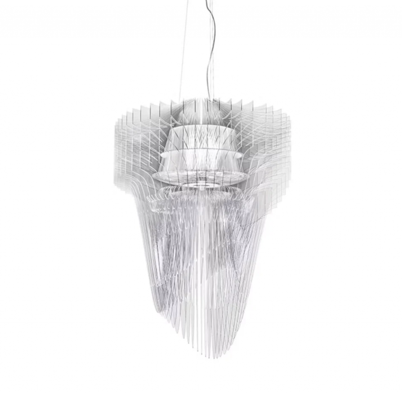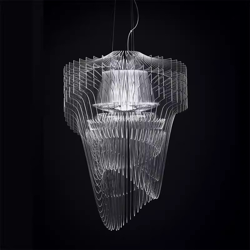 Подвесной светильник из акрила — выразительный арт-объект, который сочетает в себе свет и динамичную форму. Многослойная конструкция создает эффект движения и глубины, а полупрозрачный материал красиво преломляет свет, наполняя пространство теплым, мягким сиянием.