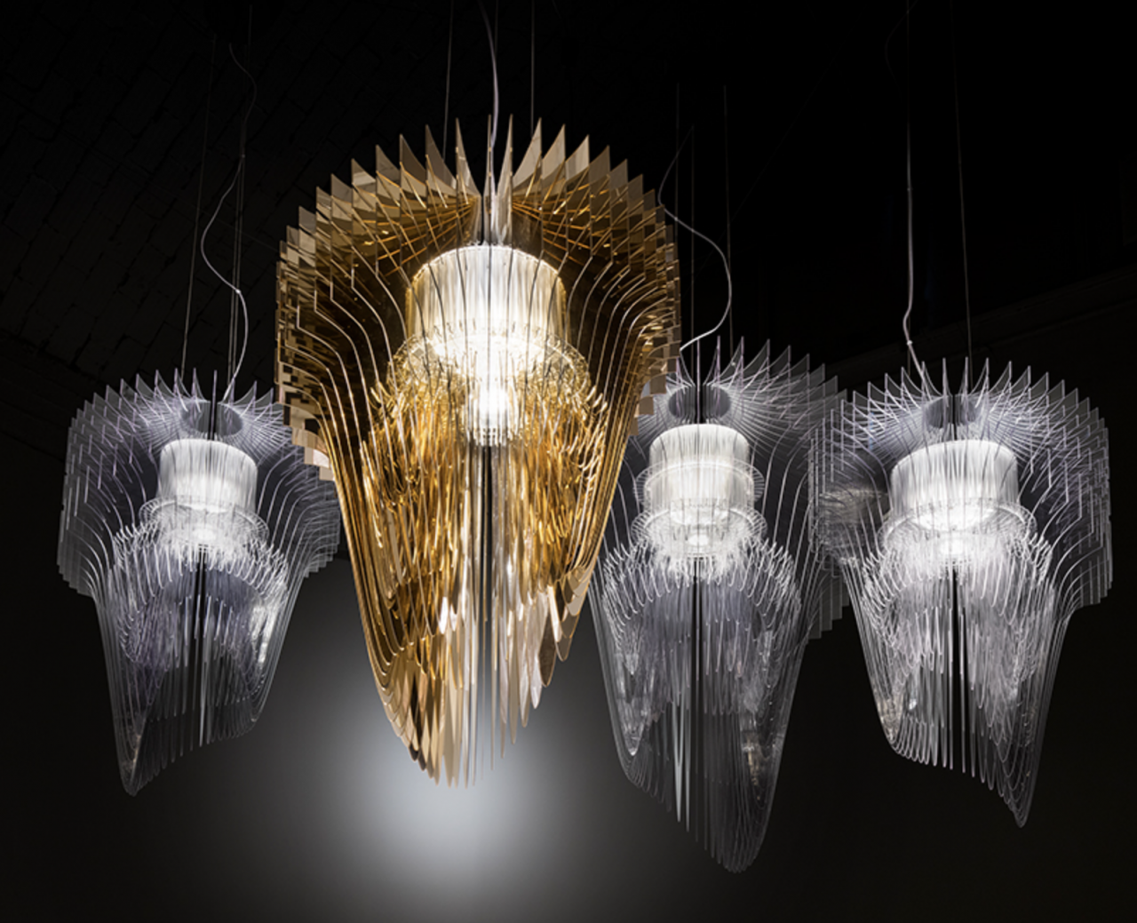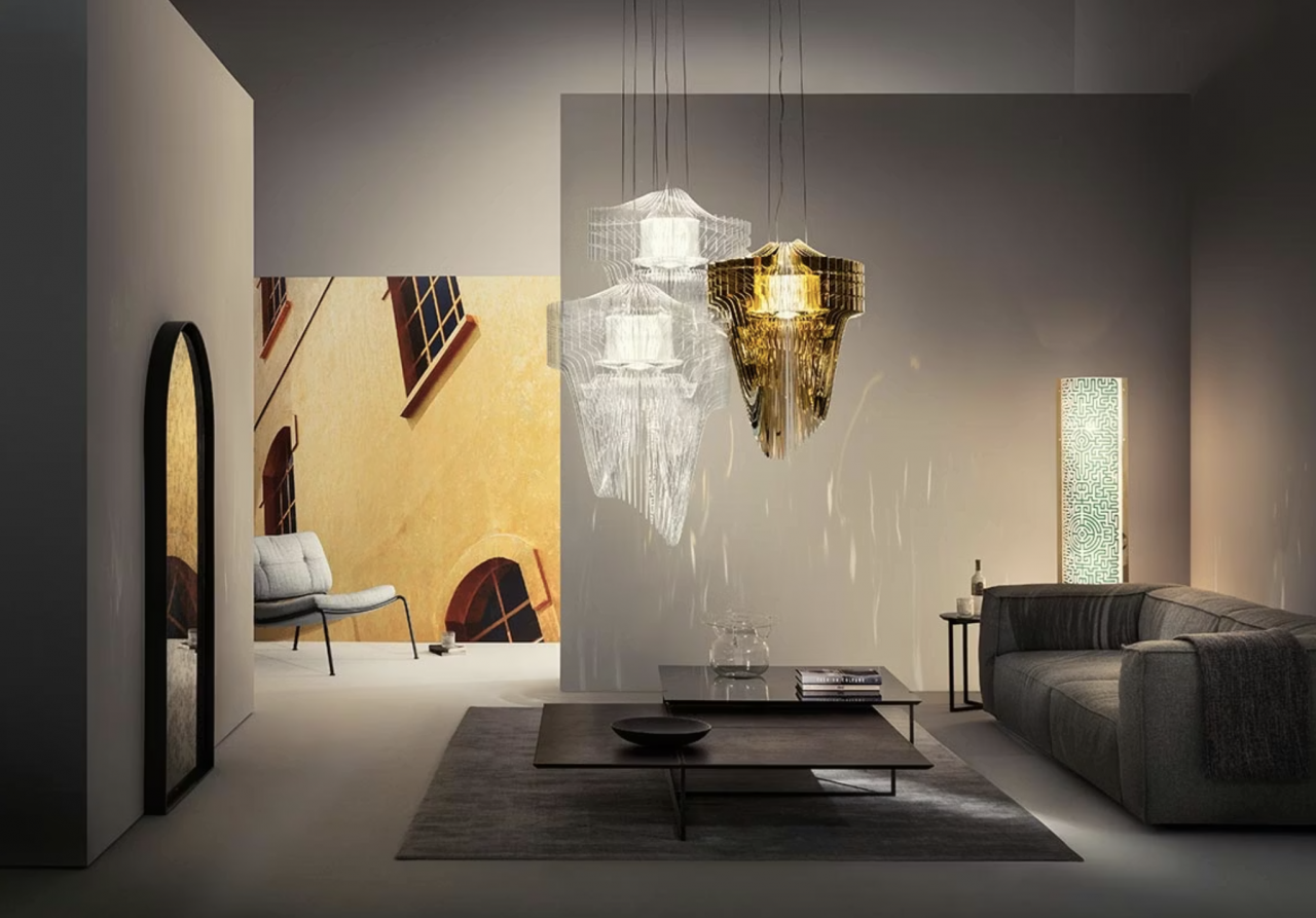 Акриловые элементы формируют сложный силуэт с эффектной игрой бликов и отражений, превращая светильник в центральный декоративный акцент интерьера.